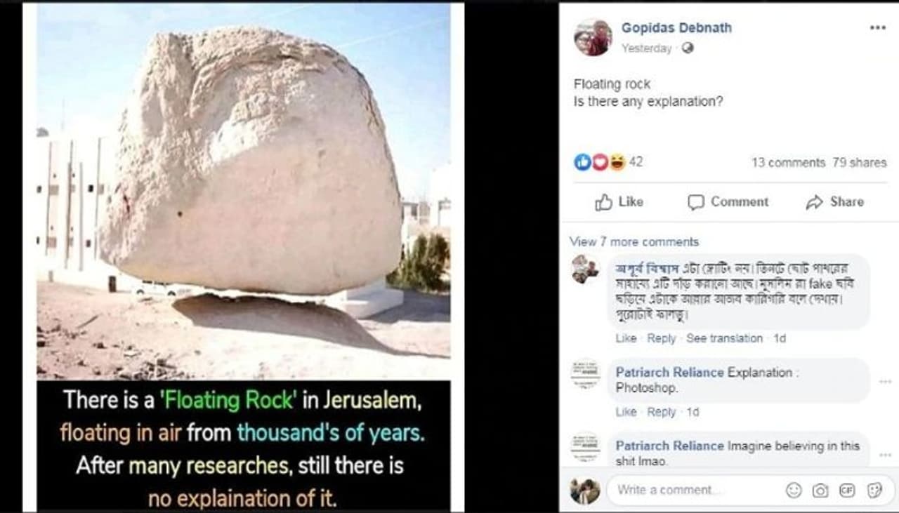 ഗോപിദാസ് ദേബ്നാഥ് എന്നയാളുടെ ഫേസ്ബുക്ക് പോസ്റ്റ് ഇങ്ങനെ. ജറുസലേമില് ഒരു ഫ്ലോട്ടിംഗ് പാറയുണ്ട്. വായുവില് ആയിരക്കണക്കിന് വര്ഷങ്ങളായി ഈ പാറ ഉയര്ന്നുനില്ക്കുകയാണ്. ഒട്ടേറെ ഗവേഷകര് ഈ പാറയെ കുറിച്ച് പഠിച്ചെങ്കിലും കാരണം ഇപ്പോഴും അവ്യക്തം. ഈ പാറയെ കുറിച്ച് ആര്ക്കെങ്കിലും കൂടുതലായി അറിയോ എന്ന ചോദ്യത്തോടെയാണ് ഗോപിദാസിന്റെ ഫേസ്ബുക്ക് പോസ്റ്റ്. വിശ്വാസ്യത കൂട്ടാനായി വായുവിലെ പാറയുടെ ചിത്രവും നല്കിയിട്ടുണ്ട്.