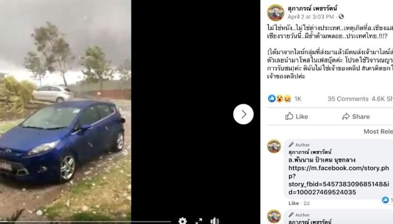 ഫേസ്ബുക്കില് ഏപ്രില് രണ്ടിന് പ്രത്യക്ഷപ്പെട്ട ഒരു പോസ്റ്റ് ഇങ്ങനെ. വലിപ്പമുള്ള ഐസ് കട്ടകള് വീടിന് സമീപം നിര്ത്തിയിട്ടിരിക്കുന്ന കാറിന് മുകളിലേക്ക് വീഴുന്ന വീഡിയോയ്ക്ക് 56 സെക്കന്റ് ദൈര്ഘ്യമാണുള്ളത്. 'ഇതൊരു സിനിമയല്ല, വിദേശത്തുനിന്ന് ഉള്ളതുമല്ല, ചിയാങ് റായ് പ്രവിശ്യയിലെ ചിയാങ്ക് സാന് പ്രവിശ്യയില് നിന്നുള്ളതാണ്'- എന്ന തലക്കെട്ടിലായിരുന്നു വീഡിയോ.
