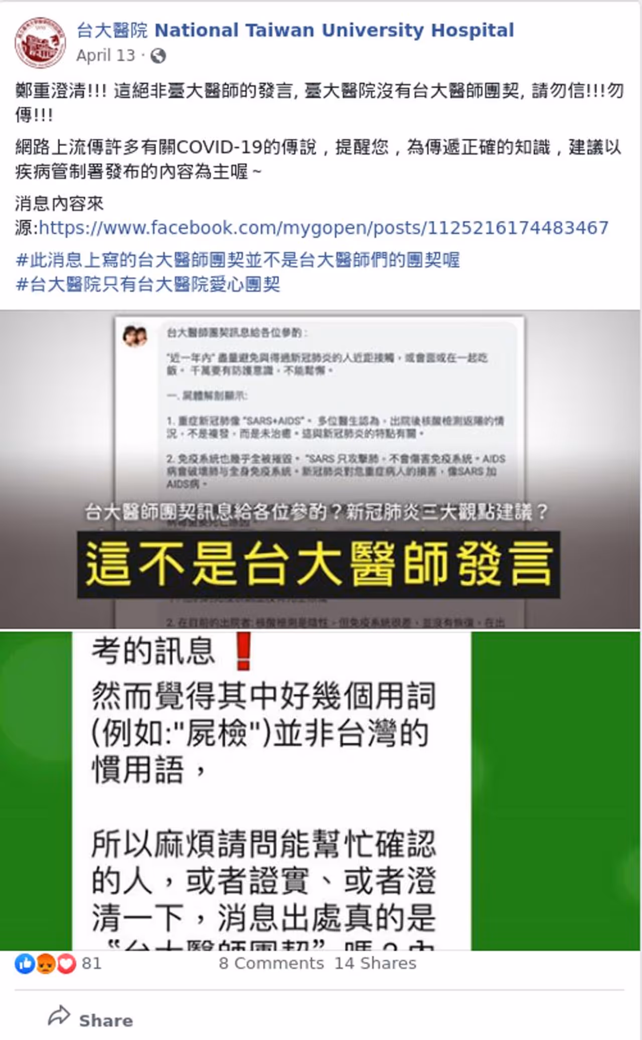 വാര്ത്താ ഏജന്സിയായ എഎഫ്പിയുടെ ഫാക്ട് ചെക്ക് വിഭാഗമാണ് ഇത് കണ്ടെത്തിയത്. തായ്വാന് നാഷണല് സര്വകലാശാലയിലെ ഡോക്ടര്മാരുടെ പ്രതികരണങ്ങളല്ല വൈറല് സന്ദേശത്തില് ഉള്ളത് എന്ന് വ്യക്തമായി. ഇത്തരം പ്രചാരണങ്ങള് വിശ്വസിക്കരുത് എന്ന് തായ്വാന് നാഷണല് സര്വകലാശാല അധികൃതര് വ്യക്തമാക്കി. തായ്വാന് ഫാക്ട് ചെക്ക് നെറ്റ്വര്ക്കായ മൈഗോപെന്(mygopen) ഉം വസ്തുത പുറത്തുകൊണ്ടുവന്നിരുന്നു.