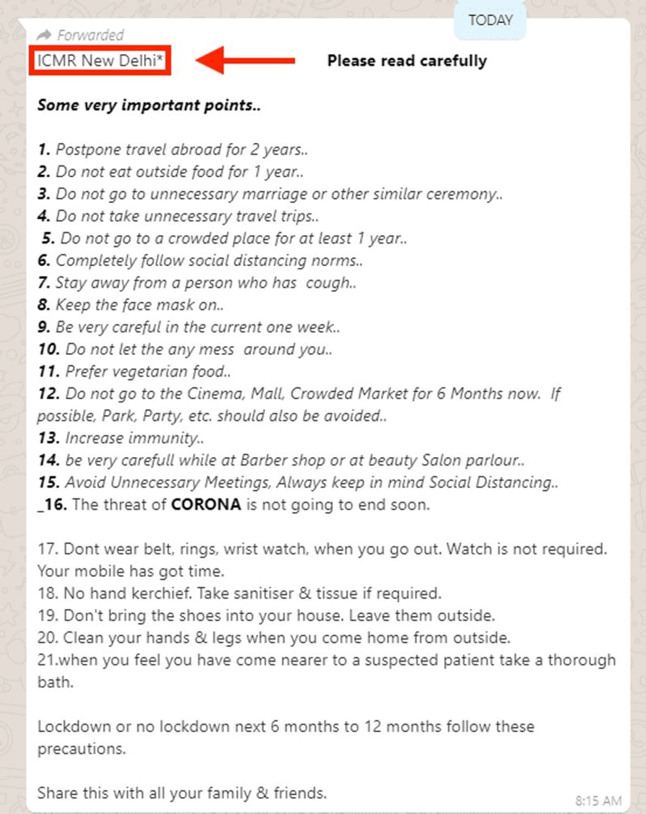 ലോക്ക് ഡൗണിന് ശേഷം ചെയ്യേണ്ടതും പാടില്ലാത്തതുമായ 21 കാര്യങ്ങളുടെ ഐസിഎംആര് പ്രസിദ്ധീകരിച്ച പട്ടിക എന്ന പേരില് വിവിധ ഭാഷകളില് പ്രചരിക്കുന്ന കുറിപ്പ് വ്യാജമാണ്. ഐസിഎംആർ ഇത്തരത്തില് ഒരു സന്ദേശം പുറത്തിറക്കിയിട്ടില്ല എന്ന് വസ്തുതാ പരിശോധനയില് വ്യക്തമായി.