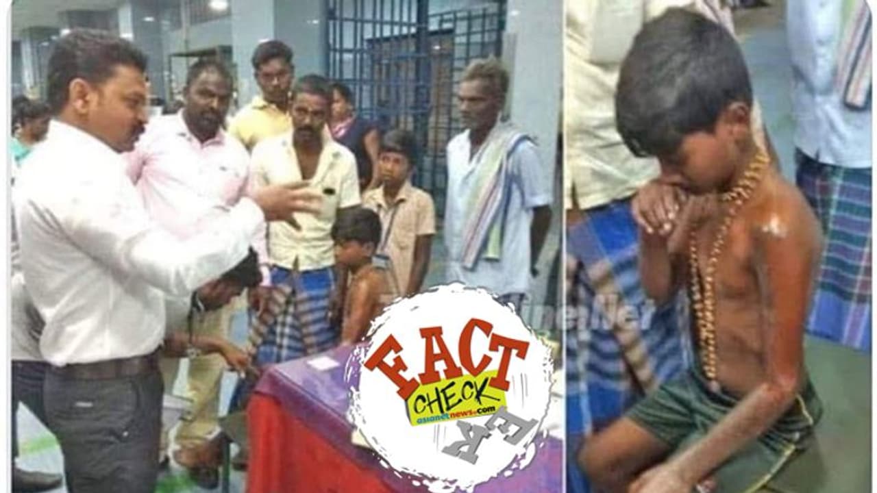 മഹാരാജ, പ്രമോദ്, വെല്രാജ്, മുരുഗപെരുമാന്,ജയകുമാര്,വസുരാജന് എന്നീ കുട്ടികളെയാണ് ഹെഡ്മാസ്റ്റര് ഇതിനായി നിയോഗിച്ചത്. ഇതില് മഹാരാജയെന്ന കുട്ടിക്കാണ് ഗുരുതരമായി പൊള്ളലേറ്റത്. ഈ സംഭവത്തേക്കുറിച്ച് ടൈംസ് ഓഫ് ഇന്ത്യയില് വന്ന വാര്ത്തയിലെ മഹാരാജയുടെ ചിത്രമാണ് വര്ഗീയവത്കരിച്ച് പ്രചരിപ്പിച്ചത്.