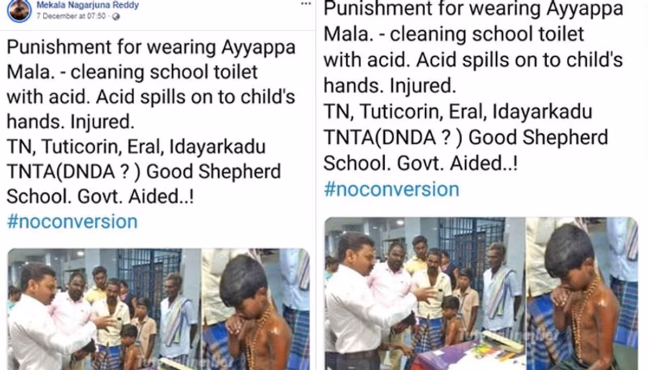 ശബരിമലയ്ക്ക് പോകാനായി മാലയിട്ട വിദ്യാര്ത്ഥിയെക്കൊണ്ട് ശുചിമുറി വൃത്തിയാക്കിപ്പിക്കുന്നതിനിടയില് പൊള്ളലേറ്റെന്ന പ്രചാരണം വ്യാജം. കഴിഞ്ഞ ദിവസങ്ങളിലാണ് മാലയിട്ട വിദ്യാര്ത്ഥി പൊള്ളലേറ്റ ചിത്രങ്ങള് സമൂഹമാധ്യമങ്ങളില് വൈറലായത്. മാലയിട്ട് വന്നതിന് സ്കൂളിലെ ശുചിമുറികള് ആസിഡ് ഒഴിച്ച് വിദ്യാര്ത്ഥിയെക്കൊണ്ട് കഴുകിച്ചെന്നും ഇതിനിടയില് ആസിഡ് തെറിച്ച് വീണ് കുട്ടിക്ക് പൊള്ളലേറ്റുവെന്നുമായിരുന്നു പ്രചാരണം. തൂത്തുക്കുടിയിലുള്ള ക്രിസ്ത്യന് മാനേജ്മെന്റ് നടത്തുന്ന ഗുഡ് ഷെപ്പേര്ഡ് സ്കൂളിലാണ് സംഭവമെന്ന രീതിയില് എത്തിയ പ്രചാരണം വന്രീതിയിലാണ് സമൂഹമാധ്യമങ്ങളില് പടര്ന്നത്.