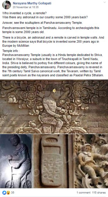ഈ ചിത്രം ശരിക്കും തിരിച്ചിറപ്പള്ളി പഞ്ചവര്ണ്ണസ്വാമി ക്ഷേത്ര ചുമരിലെ കല്ച്ചിത്രം തന്നെയാണ്. 21 ജൂലൈ 2018 ല് പ്രവീണ് മോഹന് എന്ന വ്യക്തി ഇത് സംബന്ധിച്ച് ചെയ്ത യൂട്യൂബ് വീഡിയോ അധികരിച്ച് വിവിധ മാധ്യമങ്ങള് 2000 കൊല്ലം പഴക്കമുള്ള ക്ഷേത്രത്തില് സൈക്കിളോടിക്കുന്ന മനുഷ്യന്റെ കല്ച്ചിത്രം എന്ന രീതിയില് വാര്ത്ത നല്കിയിട്ടുണ്ട്. ഇംഗ്ലീഷ് മാധ്യമങ്ങളായ മിറര് പോലും ഉണ്ട്. എന്നാല് ഇതിനെല്ലാം മുന്പ് 2015 ല് തന്നെ ഇത് സംബന്ധിച്ചുള്ള സംശയങ്ങള് ഹിന്ദു പത്രത്തില് എഴുതിയ ലേഖനത്തില് ചരിത്രകാരന് ഡോ.ആര്.കലൈകോവന് പറയുന്നുണ്ട്.