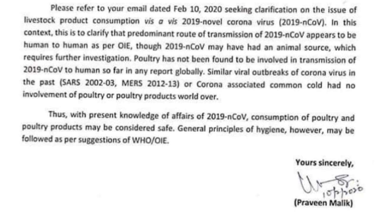 'കൊവിഡ് 19ന് ചിലപ്പോള് മൃഗങ്ങള് ഉറവിടമായേക്കാം, അത് കൂടുതല് പഠനവിധേയമാക്കേണ്ട വിഷയമാണ്. മനുഷ്യരിലേക്ക് പകരുന്നതിൽ കോഴി പങ്കാളികളാണെന്ന് ആഗോളതലത്തിൽ ഒരു റിപ്പോർട്ടും തെളിയിച്ചിട്ടില്ല. മുൻകാലങ്ങളിൽ കൊറോണ വൈറസ്(SARS 2002-03, MERS 2012 -13) റിപ്പോര്ട്ട് ചെയ്യപ്പെട്ടപ്പോഴും കോഴിയുടെ സാന്നിധ്യം സ്ഥിരീകരിച്ചിരുന്നില്ല. അതിനാൽ മാംസോല്പ്പന്നങ്ങളുടെ ഉപഭോഗം സുരക്ഷിതമായേക്കാം. എന്നിരുന്നാലും ലോകോരോഗ്യസംഘടനയുടെ(WHO) യുടെ നിർദേശങ്ങൾ അനുസരിച്ച് ശുചിത്വത്തിന്റെ പൊതുതത്ത്വങ്ങൾ പാലിക്കേണ്ടതുണ്ട്' എന്ന് കേന്ദ്ര മൃഗസംരക്ഷണ വകുപ്പ് ഫെബ്രുവരി 10ന് വ്യക്തമാക്കിയിരുന്നു.
