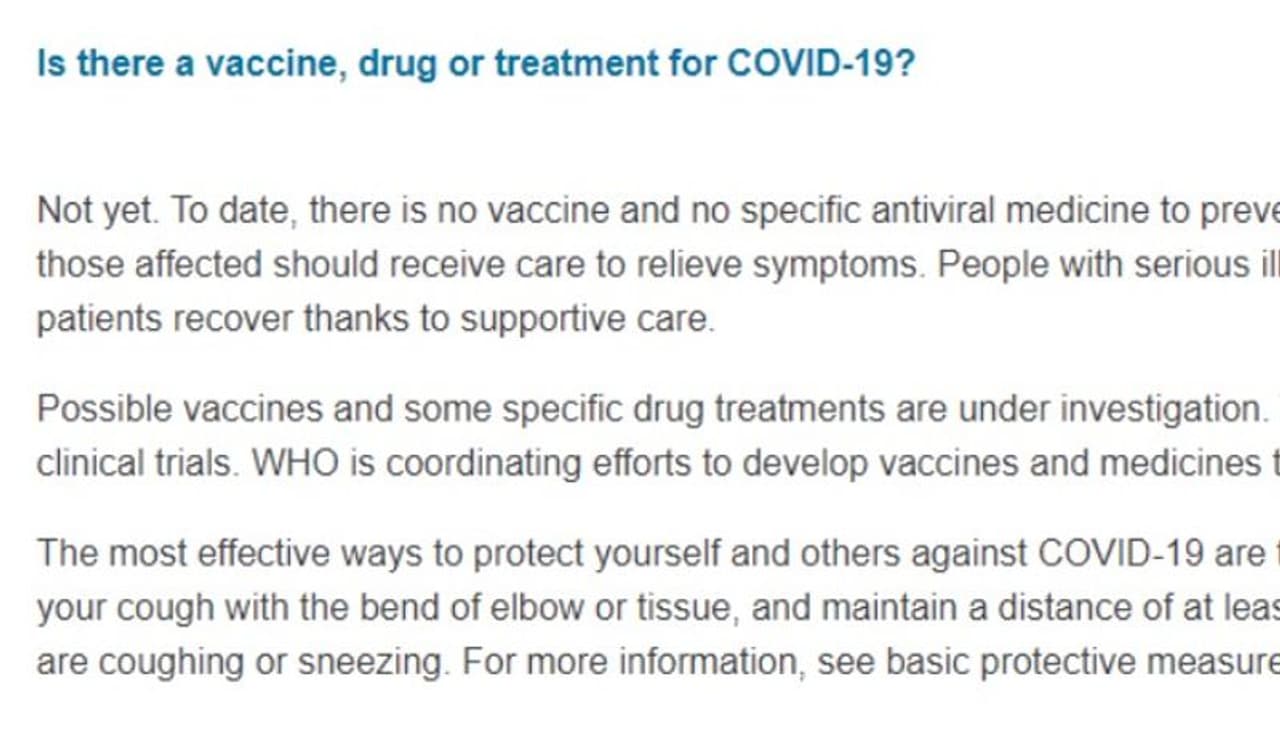 വാര്ത്താ ഏജന്സിയായ എഎഫ്പിയുടെ ഫാക്ട് ചെക്ക് വിഭാഗമാണ് കൊവിഡ് 19 വാക്സിന് സംബന്ധിച്ച വസ്തുതാ പഠനം നടത്തിയത്. കൊവിഡ് 19ന് മരുന്ന് കണ്ടെത്തിയിട്ടുണ്ടോ എന്ന ചോദ്യത്തിനുത്തരം ലോകാരോഗ്യസംഘടനയുടെ വെബ്സൈറ്റില് വിശദമായി നല്കിയിട്ടുണ്ട്.