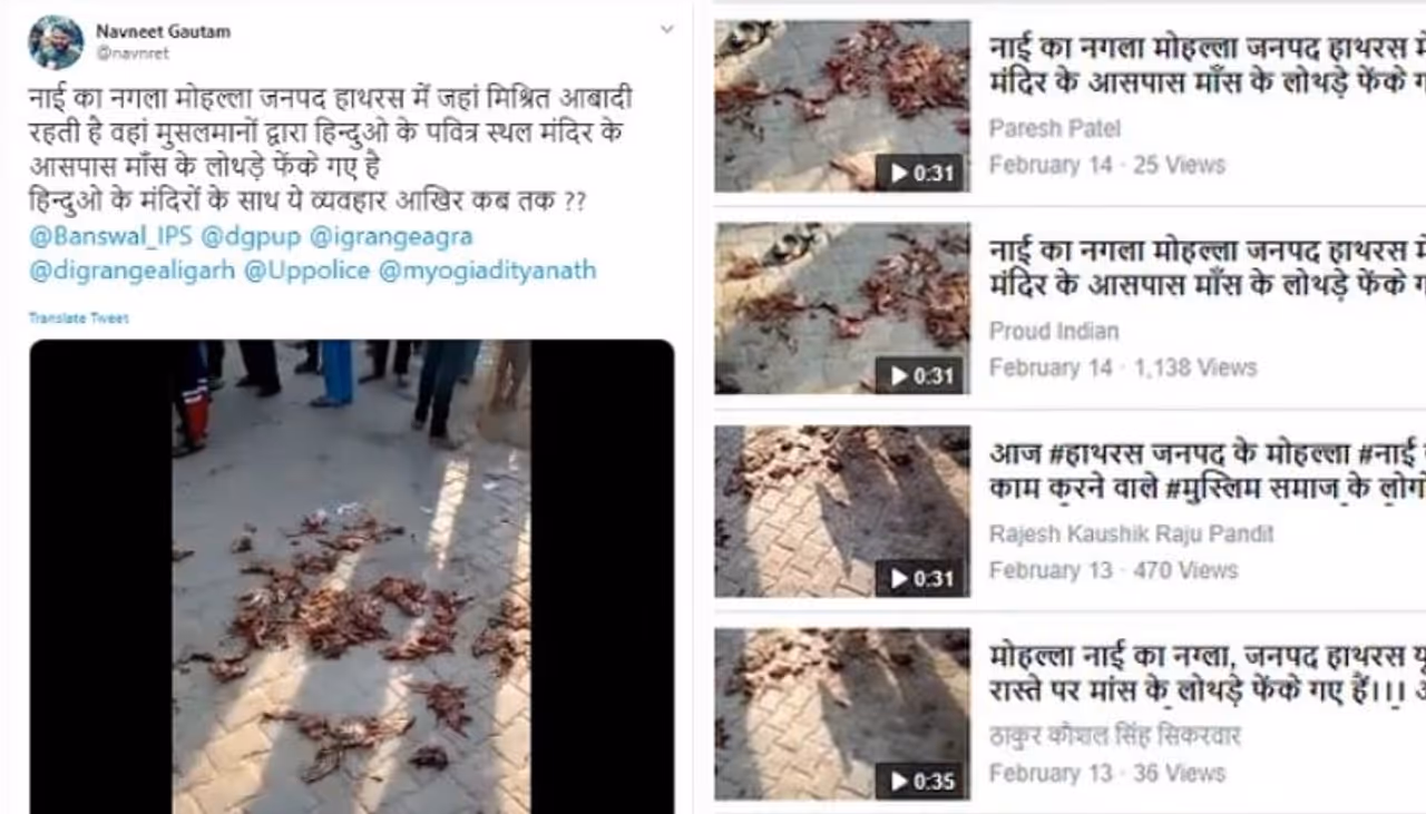 ഹത്രാസ്: ഉത്തര്പ്രദേശിലെ ഹത്രാസില് അമ്പലത്തിന് സമീപം മുസ്ലീംകള് മാംസം വിതറിയെന്ന് വ്യാജ പ്രചാരണം. 31 സെക്കന്റ് ദൈര്ഘ്യമുള്ള ഒരു വീഡിയോയിലൂടെയായിരുന്നു പ്രചാരണങ്ങള്. നവ്നീദ് ഗൗതം എന്നയാള് ഷെയര് ചെയ്ത ഒരു വീഡിയോ ഉദാഹരണം. ഈ വീഡിയോ 36,000ത്തിലേറെ പേര് കാണുകയും 2,700 റീ-ട്വീറ്റുകളുമുണ്ടായി. ഇതേ അവകാശവാദത്തോടെ ഫേസ്ബുക്കിലും നിരവധി പേര് വീഡിയോ പങ്കുവെച്ചിരുന്നു.