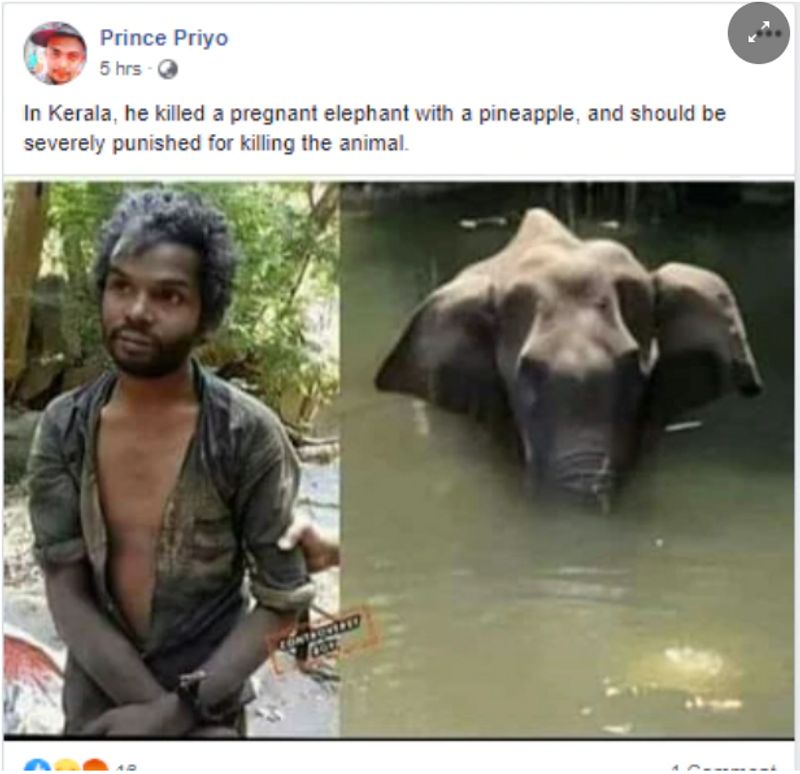 പാലക്കാട്: ഗര്ഭിണിയായ കാട്ടാന പടക്കം കടിച്ച് ചരിഞ്ഞ സംഭവം രാജ്യത്ത് വലിയ ചര്ച്ചയാണുണ്ടാക്കിയത്. സംഭവത്തില് പ്രതിഷേധവുമായി നിരവധി പേര് രംഗത്തെത്തിയതിന് പുറമെ അനവധി നുണ പ്രചാരണങ്ങളും സാമൂഹ്യമാധ്യമങ്ങളില് ഉടലെടുത്തു. അട്ടപ്പാടിയില് ആള്ക്കൂട്ട മര്ദനത്തിന് വിധേയനായി കൊല്ലപ്പെട്ട മധുവിന്റെ പേരിലും വ്യാജ പ്രചാരണമുണ്ടായി എന്നതാണ് വസ്തു.