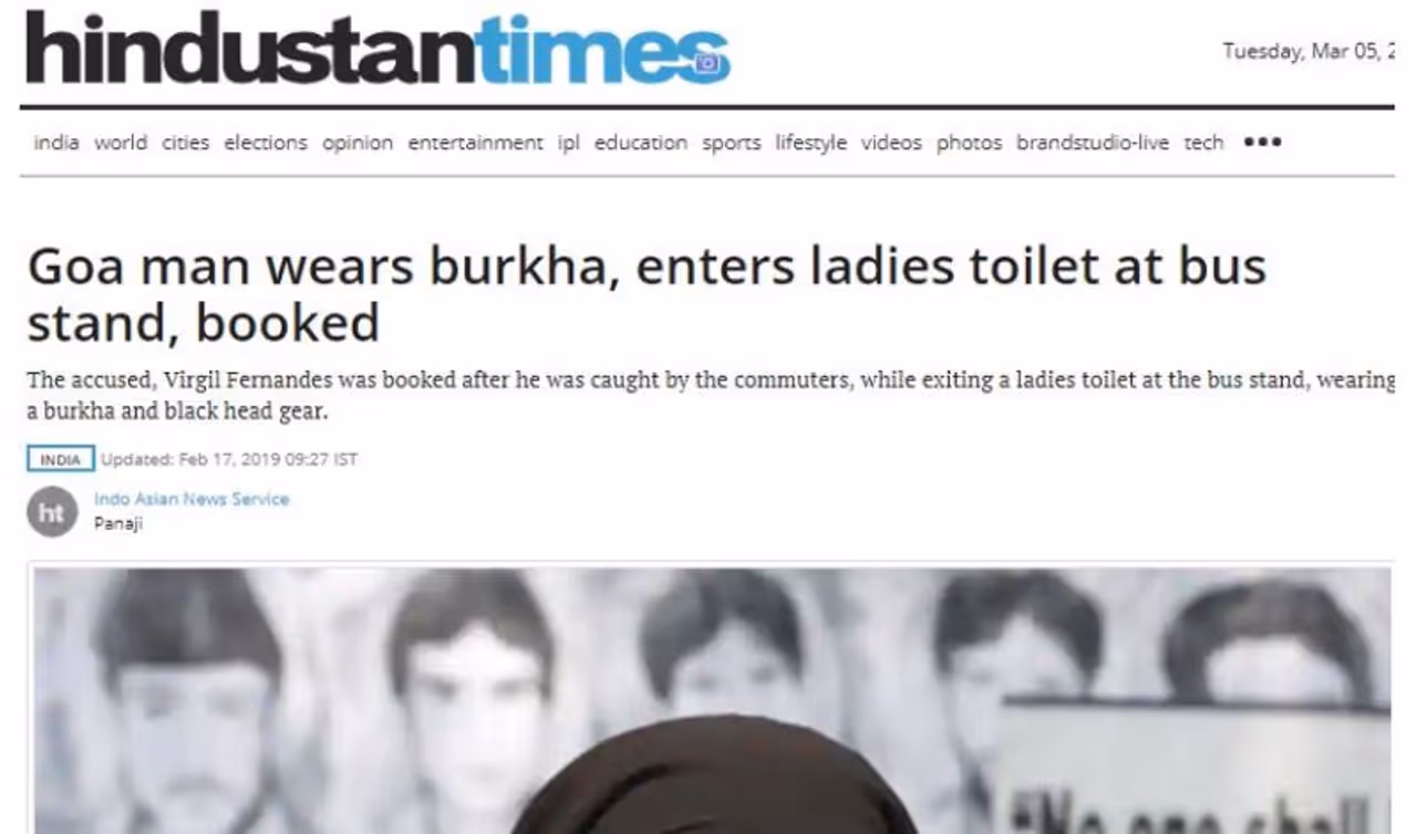 വിർജിൽ ബോസ്കോ ഫെർണാണ്ടസ് എന്നാണ് ഇയാളുടെ പേര്. ഗോവയിൽ ഒരു ബസ് സ്റ്റാന്ഡിലെ ലേഡീസ് ടോയ്ലറ്റിലാണ് ബുർഖ ധരിച്ചെത്തി ഇയാൾ അതിക്രമിച്ച് കയറിയത്. ഉടൻ തന്നെ ഇയാളെ ആളുകൾ കയ്യോടെ പിടികൂടുകയും ചെയ്തിരുന്നു. മാനസിക രോഗത്തിന് ഇയാൾ ചികിത്സയിലാണെന്നായിരുന്നു പൊലീസ് അന്ന് ബൂം ലൈവ് ന്യൂസിനോട് പറഞ്ഞിരുന്നത്.