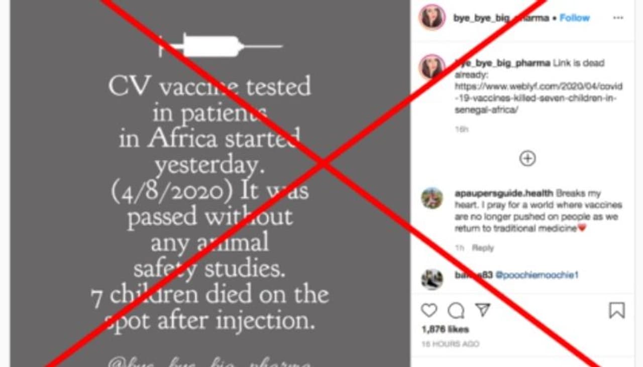 ഡാക്കർ: കൊവിഡ് 19ന് തടയിടാനുള്ള വാക്സിനുകള്ക്കായി തീവ്ര പരീക്ഷണമാണ് അമേരിക്ക ഉള്പ്പടെയുള്ള രാജ്യങ്ങളില് നടക്കുന്നത്. ഇതിനിടെ സെനഗലില് വാക്സിന് പരീക്ഷണം നടന്നതായും ഏഴ് കുട്ടികള് മരിച്ചെന്നും പ്രചാരണം സജീവമാണ്. 'കൊവിഡ് 19നെ ചെറുക്കാന് വ്യാപക വാക്സിനേഷന് സെനഗലില് ഇന്നലെ ആരംഭിച്ചു. ആദ്യമായി മരുന്ന് സ്വീകരിച്ച ഏഴ് കുട്ടികളും തല്ക്ഷണം മരിച്ചു' എന്നാണ് പ്രചാരണം.