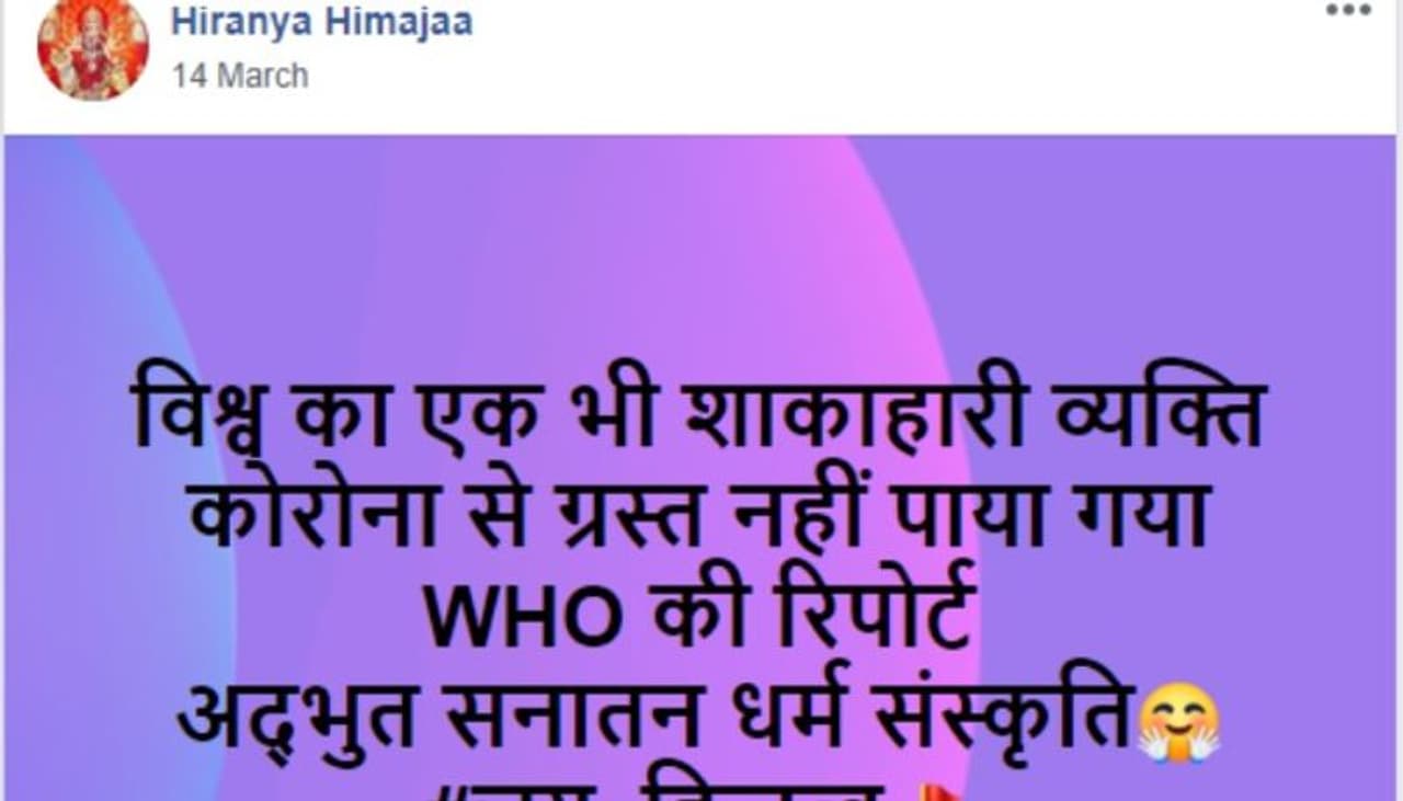 സാമൂഹ്യമാധ്യമങ്ങളില് ഹിന്ദിയില് പ്രചരിക്കുന്ന ചില പോസ്റ്റുകളിലാണ് സസ്യാഹാരികള്ക്ക് കൊവിഡ് പിടിപെടുന്നില്ല എന്ന് പറയുന്നത്. ലോകത്ത് ഇതുവരെ ഒരു വെജിറ്റേറിയന് പോലും കൊവിഡ് ബാധിച്ചില്ല എന്ന് ലോകാരോഗ്യ സംഘടനയുടെ(WHO) റിപ്പോര്ട്ടില് പറയുന്നതായാണ് ഫേസ്ബുക്ക് പോസ്റ്റ്. സമാനമായ നിരവധി പോസ്റ്റുകളും ട്വീറ്റുകളുമാണ് സാമൂഹ്യമാധ്യമങ്ങളില് പ്രചരിക്കുന്നത്.