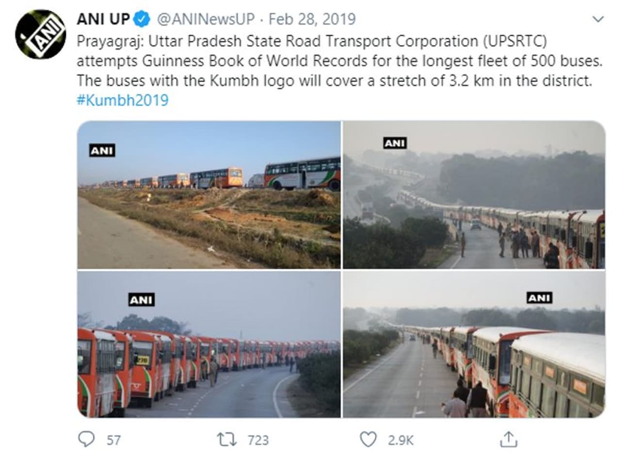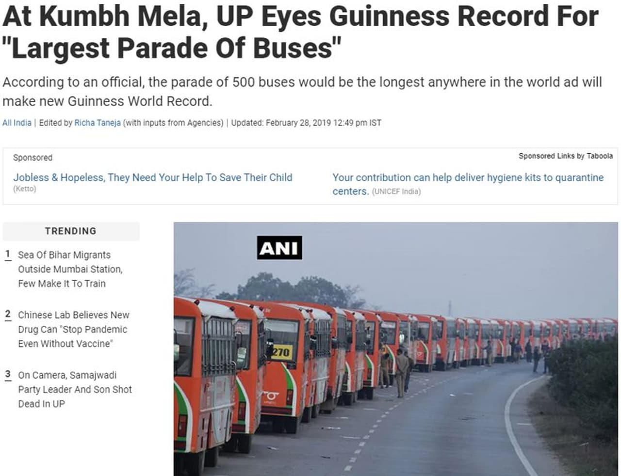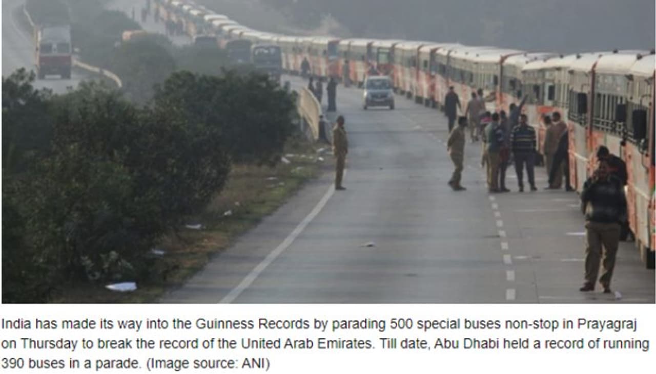 കുംഭമേളക്കായി 500 പ്രത്യേക ബസുകള് അണിനിരത്തി യുപി സര്ക്കാര് ഗിന്നസ് ബുക്കില് ഇടംനേടിയിരുന്നു. ഇക്കാര്യം ഫിനാന്ഷ്യല് എക്സ്പ്രസ് റിപ്പോര്ട്ട് ചെയ്തതിന്റെ സ്ക്രീന് ഷോട്ട് ചുവടെ കൊടുക്കുന്നു. അണിനിരന്ന ബസുകളുടെ നിരവധി ചിത്രങ്ങള് ഈ വാര്ത്തയിലുണ്ട്. യുപി സര്ക്കാരിന് ലഭിച്ച ഗിന്നസ് സര്ട്ടിഫിക്കറ്റിന്റെ ചിത്രവും കാണാം.