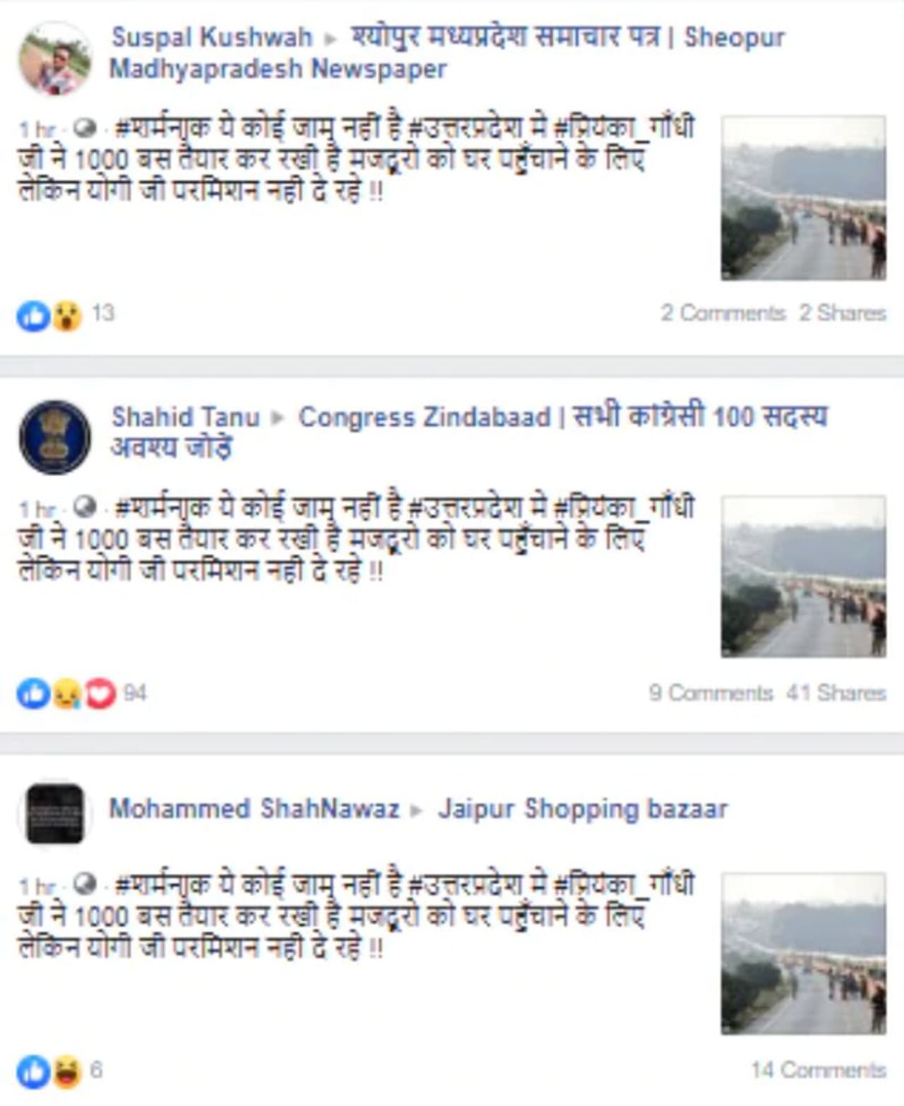 പ്രിയങ്ക ഗാന്ധിയുടെ വീഡിയോ പുറത്തുവന്നതിന് പിന്നാലെ അനുമതി കാത്തുനില്ക്കുന്ന ബസുകളുടെ ചിത്രം എന്ന തലക്കെട്ടോടെ സാമൂഹ്യമാധ്യമങ്ങളില് നിരവധി പോസ്റ്റുകള് പ്രത്യക്ഷപ്പെട്ടു. കോണ്ഗ്രസ് അനുകൂല അക്കൗണ്ടുകളില് നിന്നായിരുന്നു ഈ പോസ്റ്റുകളും ട്വീറ്റുകളും.