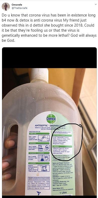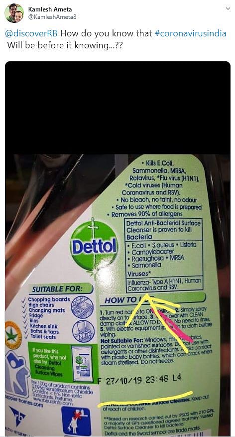 കൊറോണ ഭീതി പടരുമ്പോള് ഇത് മനുഷ്യ നിര്മ്മിതമായ അസുഖമാണെന്നും മരുന്ന് കമ്പനികളാണ് ഭീതി പടര്ത്തുന്നതെന്നുമുള്ള വാദങ്ങള്ക്ക് പിന്തുണയായാണ് 2019ലെ ഡെറ്റോളിന്റെ പാക്കറ്റില് കൊറോണ വൈറസ് എന്ന കുറിപ്പ് കണ്ടത്. ആരോ ചിത്രം സമൂഹ മാധ്യമങ്ങളില് പങ്കുവയ്ക്കുകയും ചെയ്തതോടെ സംഭവം വൈറലായി.