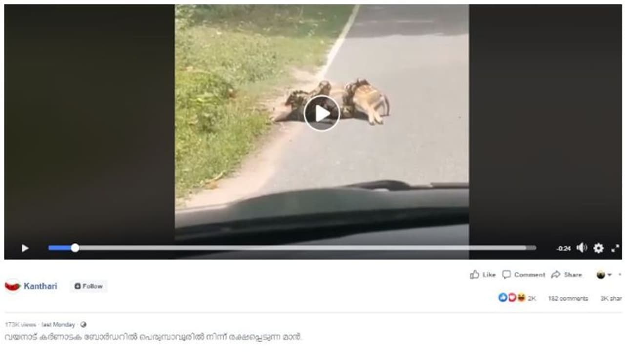 സാമൂഹ്യ മാധ്യമങ്ങളിൽ വ്യാജ വീഡിയോകളുടെ കുത്തൊഴുക്കാണ്. ഇത്തരത്തിൽ സംശയം ജനിപ്പിക്കുന്നൊരു വീഡിയോ വയനാട്- കര്ണാടക അതിർത്തിയില് നിന്ന് എന്ന പേരിൽ പ്രചരിക്കുകയാണ്. പെരുമ്പാമ്പിൽ നിന്ന് രക്ഷപ്പെടുന്ന മാനിന്റേതായി വ്യാപക പ്രചാരണം നേടിയ വീഡിയോയുടെ സത്യാവസ്ഥയെന്താണ്? കഴിഞ്ഞ തിങ്കളാഴ്ചയാണ് കാന്താരി എന്ന ഫേസ്ബുക്ക് പേജില് ഈ വീഡിയോ പോസ്റ്റ് ചെയ്തത്.