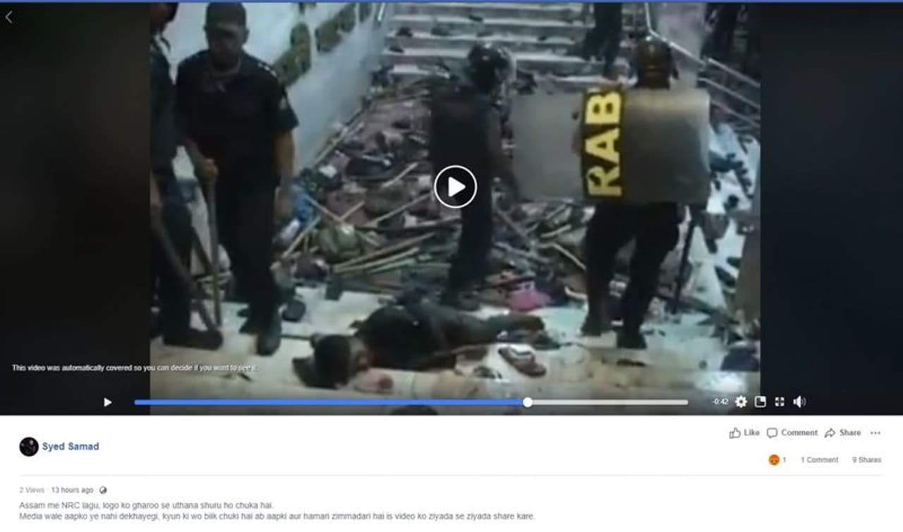 'അസമില് എന്ആര്സി നടപ്പാക്കിയിരിക്കുന്നു. ആളുകളെ വീടുകളില് കയറി പിടികൂടുകയാണ്. മാധ്യമങ്ങള് ഈ വാര്ത്ത റിപ്പോര്ട്ട് ചെയ്യുകയില്ല. അതുകൊണ്ട് കഴിയുന്നത്ര ജനങ്ങളിലേക്ക് ഈ വീഡിയോ എത്തിക്കേണ്ടത് നമ്മുടെ ഉത്തരവാദിത്വമാണ്' എന്ന് ഹിന്ദിയില് എഴുതിയ കുറിപ്പിനൊപ്പമാണ് ഫേസ്ബുക്കില് ഈ വീഡിയോ പങ്കുവെച്ചത്. സെയ്ദ് സമദ് എന്ന പേരിലുള്ള ഫേസ്ബുക്ക് അക്കൗണ്ടിലാണ് ഇത് പ്രത്യക്ഷപ്പെട്ടത്. ജനങ്ങളെ തല്ലിച്ചതയ്ക്കുന്ന പൊലീസുകാരെയും രക്ഷപ്പെടാന് ഓടുന്ന ജനങ്ങളുമാണ് വീഡിയോയിലുള്ളത്.