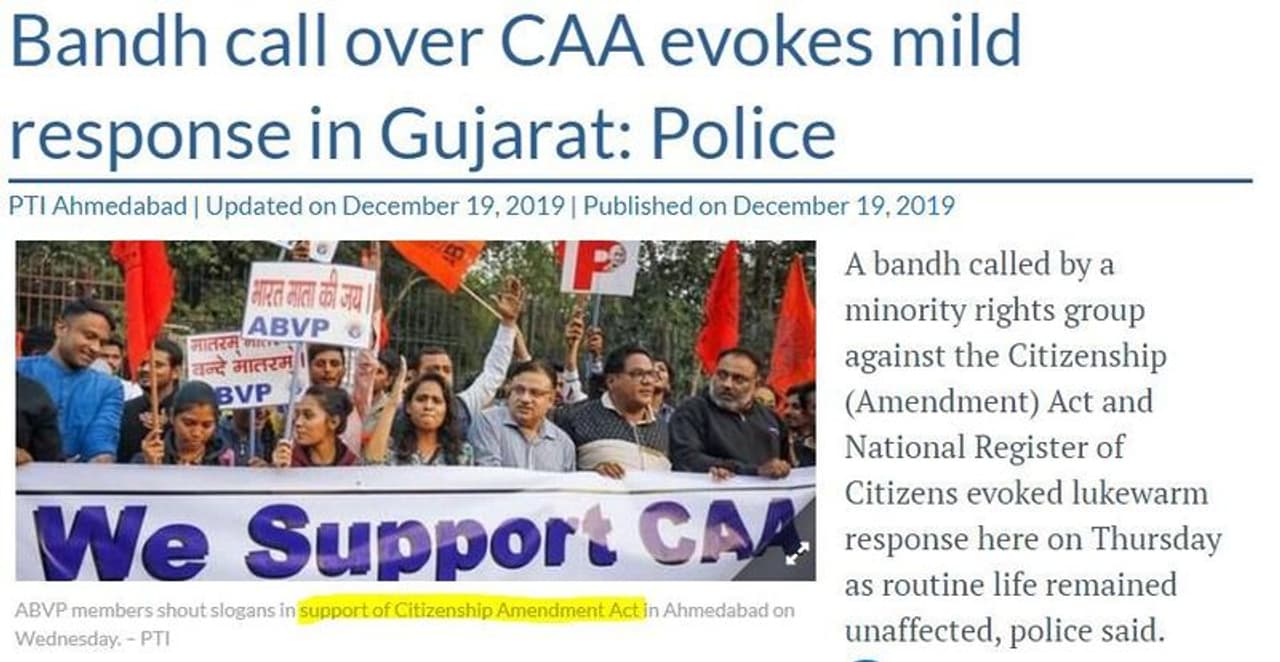 'West Bong'എന്ന ഫേസ്ബുക്ക് പേജിലാണ് ഈ ചിത്രം പങ്കുവെച്ചത്. എന്നാല് ഇപ്പോള് ആ പേജില് ചിത്രത്തോടൊപ്പമുള്ള കുറിപ്പ് തിരുത്തി ഇത് വെറും മീം ആണെന്ന രീതിയിലാക്കിയിട്ടുണ്ട്. അഹമ്മദാബാദ് മിററിന് വേണ്ടി ഫോട്ടോ ജേണലിസ്റ്റായ ആന്സെല ജമീന്ദാര് പകര്ത്തിയ ചിത്രമാണിതെന്ന് 'ബൂം ലൈവ്' റിപ്പോര്ട്ട് ചെയ്യുന്നു. പൗരത്വ നിയമ ഭേദഗതിയെ അനുകൂലിച്ച് 500ഓളം എബിവിപി പ്രവര്ത്തകര് സബര്മതി ആശ്രമത്തില് സംഘടിപ്പിച്ച പ്രകടനമാണ് യഥാര്ത്ഥത്തില് ഈ ചിത്രത്തിലുള്ളത്.