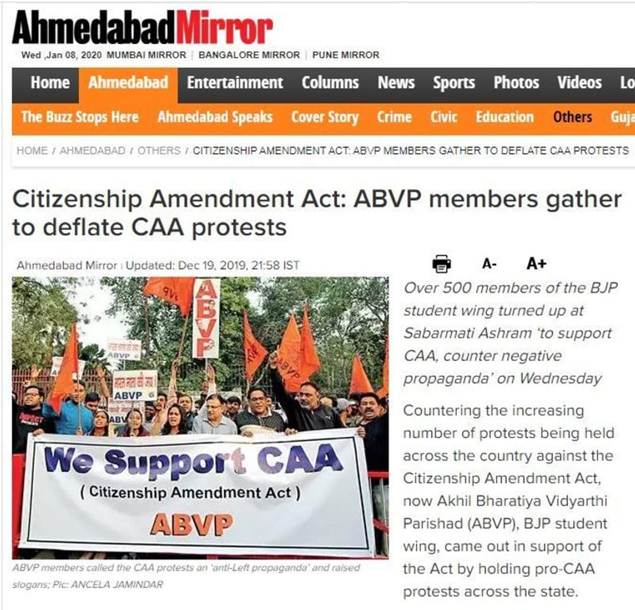 ഗുവാഹത്തി: പൗരത്വ നിയമ ഭേദഗതിക്കെതിരെ രാജ്യവ്യാപകമായി നിരവധി പ്രതിഷേധങ്ങള് നടക്കുകയാണ്. കേന്ദ്രസര്ക്കാരിനെതിരെ മുദ്രാവാക്യങ്ങളുമായി വിദ്യാര്ത്ഥികള് ഉള്പ്പെടെ രംഗത്തെത്തിയിരുന്നു. ഇതിനിടെ സോഷ്യല് മീഡിയയില് വൈറലാകുകയാണ് ദേശീയ പൗരത്വ രജിസ്റ്ററിനെതിരെയും പൗരത്വ നിയമ ഭേദഗതിക്കെതിരെയും പ്രതിഷേധിക്കുന്ന എബിവിപി പ്രവര്ത്തകരുടെ ചിത്രം. അസമിലെ എബിവിപി പ്രവര്ത്തകര് എന്ആര്സിക്കെതിരെയും പൗരത്വ നിയമ ഭേദഗതിക്കെതിരെയും പ്രതിഷേധിക്കുന്നു എന്ന രീതിയില് പ്രചരിച്ച ചിത്രത്തിന്റെ സത്യാവസ്ഥ പക്ഷേ മറ്റൊന്നാണ്.