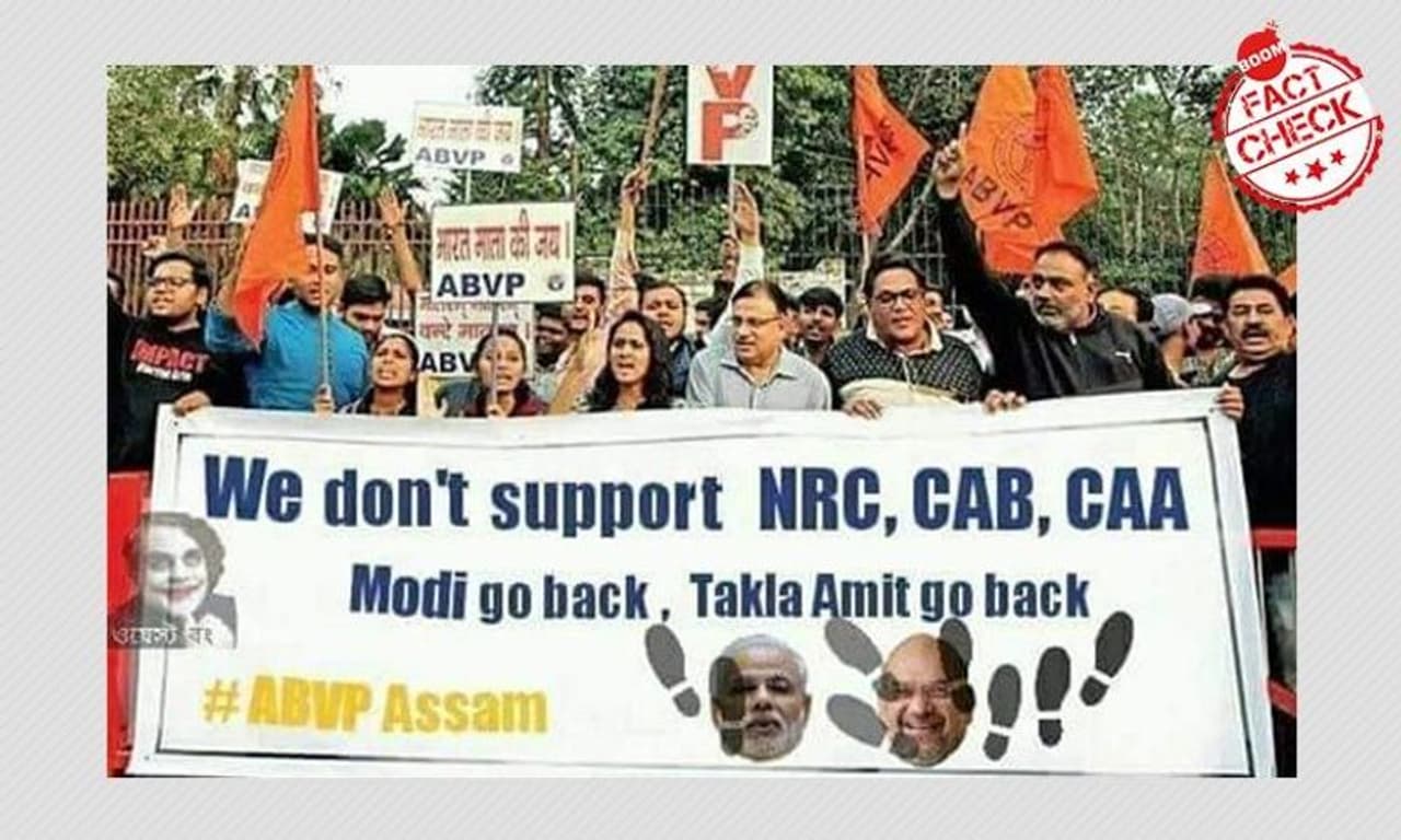 'വീ ഡോണ്ട് സപ്പോര്ട്ട് എന്ആര്സി, സിഎബി, സിഎഎ' എന്ന മുദ്രാവാക്യമെഴുതിയ ബാനറുമായി പ്രതിഷേധിക്കുന്ന, എബിവിപിയുടെ കൊടികളേന്തിയ പ്രവര്ത്തകരെ ചിത്രത്തില് കാണാം. പ്രധാനമന്ത്രി നരേന്ദ്ര മോദിയും അമിത് ഷായും ഗോ ബാക്ക് എന്നും എബിവിപി അസം എന്നും ബാനറില് എഴുതിയിട്ടുണ്ട്. പല അടിക്കുറിപ്പുകള്ക്കൊപ്പം ട്വിറ്ററിലും ഫേസ്ബുക്കിലും വൈറലായിരുന്നു ഈ ചിത്രം.