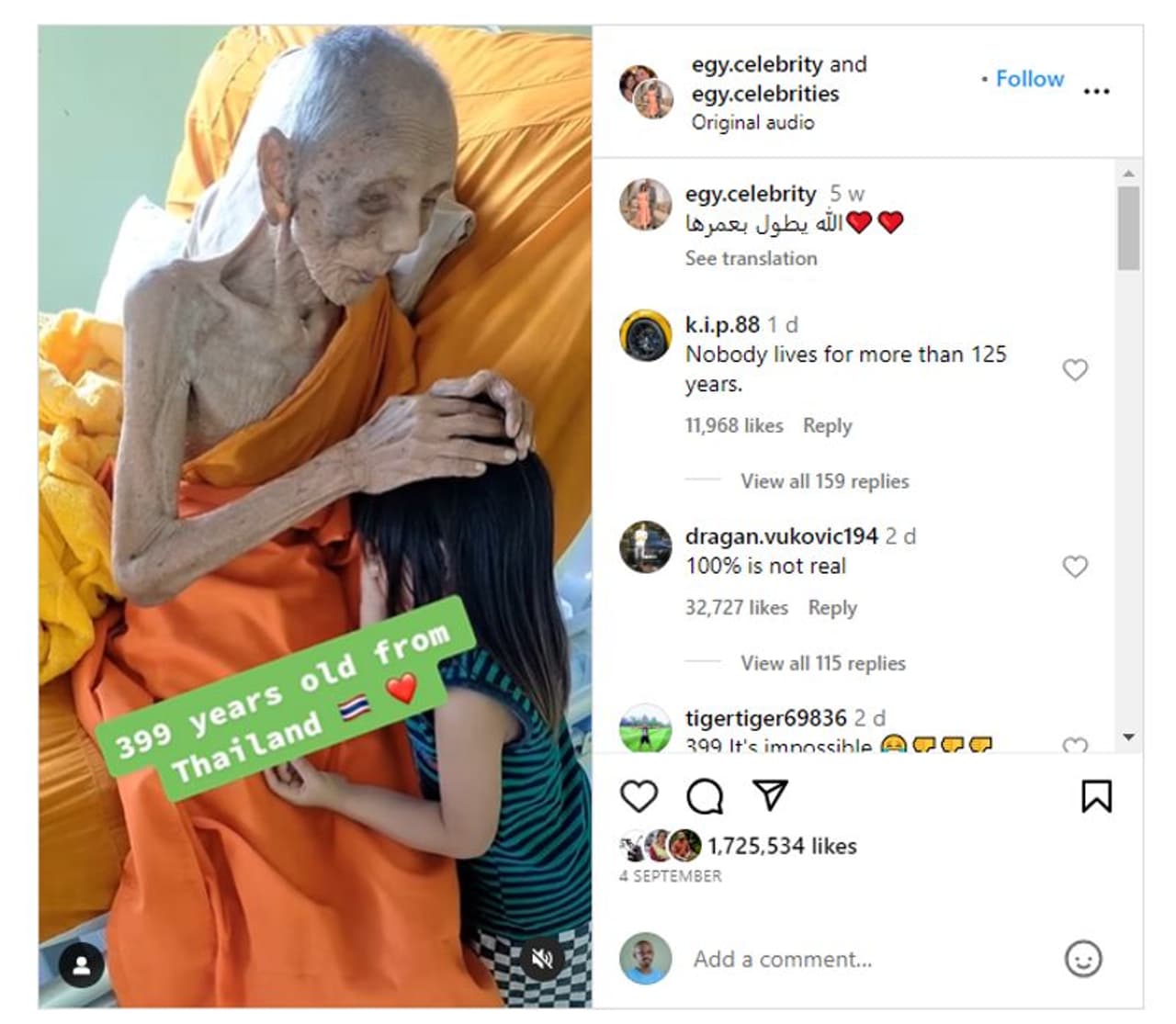 തായ്ലന്ഡില് നിന്നുള്ള 399 വയസുള്ളയാള് എന്ന എഴുത്തോടെ ഈ റീല്സ് ഇന്സ്റ്റഗ്രാമില് egy.celebrity എന്ന അക്കൗണ്ടില് നിന്നാണ് പങ്കുവെച്ചിരിക്കുന്നത്. സെപ്റ്റംബര് നാലാം തിയതിയായിരുന്നു വീഡിയോ പോസ്റ്റ് ചെയ്തത്. ഏറെ പ്രായം തോന്നിക്കുന്ന, സന്യാസി വേഷത്തിലുള്ള ആള് ഒരു കൂട്ടിയുടെ തലയില് എന്തോ മന്ത്രിക്കുന്നതായാണ് വീഡിയോയില് കാണുന്നത്. ഇതിനകം 17 ലക്ഷത്തിലധികം ലൈക്ക് ഈ വീഡിയോയ്ക്ക് ലഭിച്ചു.