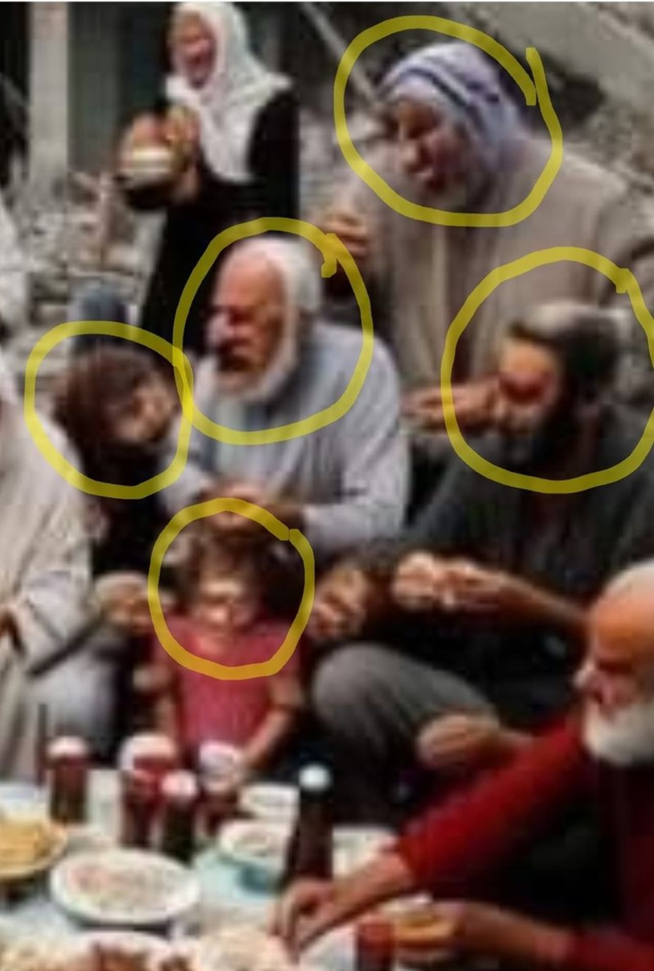 പ്രചരിക്കുന്ന ചിത്രത്തിന്റെ വസ്തുത മനസിലാക്കാന് ഏഷ്യാനെറ്റ് ന്യൂസ് ഓണ്ലൈന് ഫാക്ട് ചെക്ക് ടീമിന് അധികം പാടുപെടേണ്ടിവന്നില്ല. തീന്മേശയ്ക്ക് ചുറ്റും കൂടിയിരിക്കുന്ന ആളുകളുടെ രൂപത്തിലുള്ള അപൂര്ണതയാണ് ഫോട്ടോ യാഥാര്ഥ്യമല്ല എന്ന ആദ്യ സൂചന നല്കിയത്. പലരുടെയും മൂക്ക്, ചെവി, കൈകള് തുടങ്ങിയ പല ഭാഗങ്ങള്ക്കും സ്വാഭാവികത തോന്നിക്കുന്നില്ല എന്ന് ചിത്രം സൂം ചെയ്തതില് നിന്ന് മനസിലാക്കി. ചിത്രത്തിലുള്ള മിക്കയാളുകളുടെയും മുഖത്തിന് ഈ രൂപവ്യത്യാസം പ്രകടമാണ്. ചിത്രത്തിലുള്ള പലരുടെയും കൈകള്ക്കും കാലുകള്ക്കും നാല് വിരലുകള് മാത്രമേ കാണാനാകുന്നുള്ളൂ. ഒരു കുട്ടിക്ക് തന്നെ വലതുഭാഗത്ത് രണ്ട് കൈകള് കാണാം. തെളിവായി താഴെയുള്ള ചിത്രങ്ങള് ശ്രദ്ധിക്കുക.