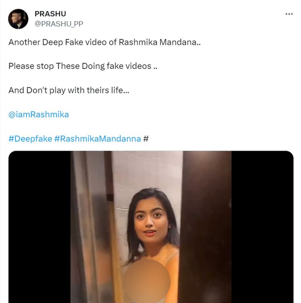 PRASHU എന്ന എക്സ് (പഴയ ട്വിറ്റർ) യൂസറാണ് രശ്മിക മന്ദാനയുടെതായി മറ്റൊരു ഡീപ് ഫേക്ക് വീഡിയോ കൂടി സോഷ്യല് മീഡിയയില് പ്രചരിക്കുന്നതായി ട്വീറ്റ് ചെയ്ത ഒരാള്. 'രശ്മിക മന്ദാനയുടെ മറ്റൊരു ഡീപ് ഫേക്ക് വീഡിയോ കൂടി, ഇത്തരം വ്യാജ ദൃശ്യങ്ങള് പ്രചരിക്കുന്നത് അവസാനിപ്പിക്കുക, നടിയുടെ ജീവിതം വച്ച് പന്താടരുത്' എന്നുമുള്ള കുറിപ്പോടെയാണ് പ്രഷു 7 സെക്കന്ഡ് ദൈർഘ്യമുള്ള വീഡിയോ 2023 ഡിസംബർ 13ന് ട്വീറ്റ് ചെയ്തത്. ലിഫ്റ്റിലേക്ക് ആരോ കയറാന് വരുമ്പോള് വാതില് അടയുന്നത് ഒഴിവാക്കാന് നടി കൈനീട്ടുന്നതായാണ് വീഡിയോ.