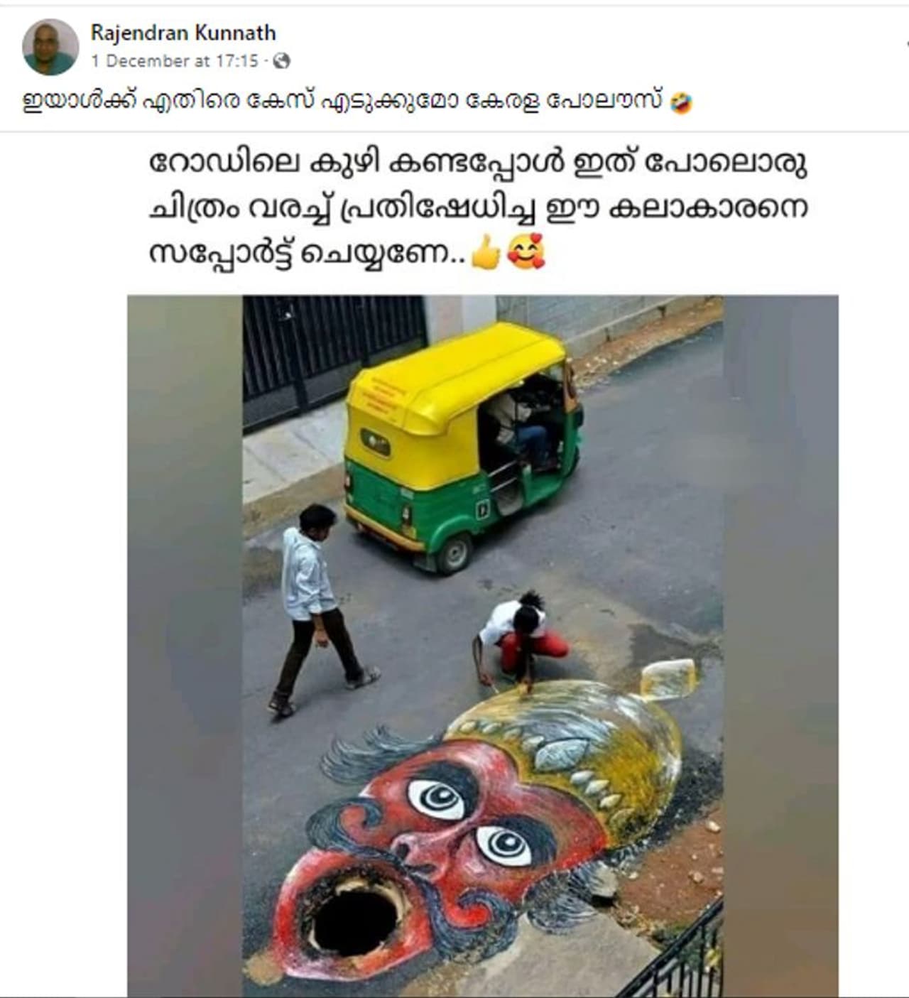 റോഡിലെ ഗര്ത്തം ഉപയോഗപ്പെടുത്തി ഒരു കലാകാരന് ചിത്രം വരയ്ക്കുന്നതിന്റെ ഫോട്ടോയാണ് ഫേസ്ബുക്കില് ഷെയര് ചെയ്യപ്പെടുന്നത്. 'റോഡിലെ കുഴി കണ്ടപ്പോള് ഇത് പോലൊരു ചിത്രം വരച്ച് പ്രതിഷേധിച്ച ഈ കലാകാരനെ സപ്പോര്ട്ട് ചെയ്യണേ. ഇയാള്ക്ക് എതിരെ കേസ് എടുക്കുമോ കേരള പോലീസ്' എന്ന ചോദ്യത്തോടെയാണ് 2023 ഡിസംബര് 1ന് രാജേന്ദ്രന് കുന്നത്ത് എന്നയാളുടെ ഫേസ്ബുക്ക് പോസ്റ്റ്.