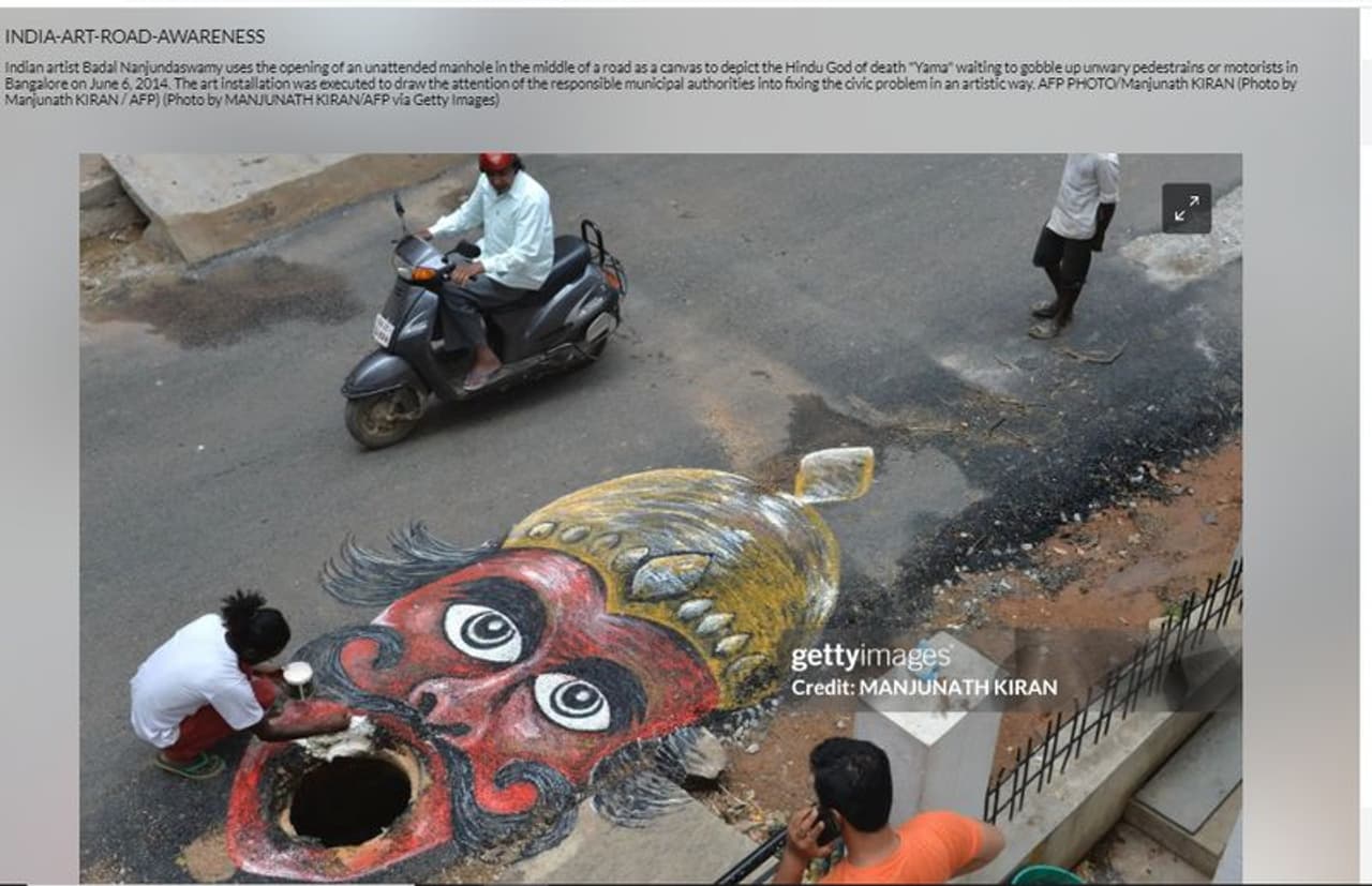 ചിത്രത്തിന്റെ വസ്തുത മനസിലാക്കാന് ഫോട്ടോ റിവേഴ്സ് ഇമേജ് സെര്ച്ചിന് വിധേയമാക്കുകയാണ് ആദ്യം ചെയ്തത്. ഫോട്ടോ ഷെയറിംഗ് ഏജന്സിയായ ഗെറ്റി ഇമേജസ് 2014 ജൂണ് ആറിന് ഇതേ ചിത്രം അപ്ലോഡ് ചെയ്തിട്ടുള്ളതാണ് എന്ന് പരിശോധനയില് കണ്ടെത്താനായി. ബെംഗളൂരുവില് 2014 ജൂണ് ആറിനാണ് ഈ ചിത്രം വരച്ചത് എന്നും ഇത് വരച്ച കലാകാരന്റെ പേര് ബാദല് നഞ്ജുണ്ടസ്വാമി എന്നാണെന്നും ഗെറ്റി ഇമേജസ് നല്കിയ വിവരണത്തില് കാണാം. വാര്ത്താ ഏജന്സിയായ എഎഫ്പിക്കായി മഞ്ജുനാഥ് കിരണാണ് ഈ ഫോട്ടോ പകര്ത്തിയത് എന്നും ഗെറ്റി ഇമേജസ് വിവരണത്തില് പറയുന്നു. മാന്ഹോളിന്റെ പശ്ചാത്തലത്തില് യമരാജനെ വരയ്ക്കുകയായിരുന്നു ബാദല് നഞ്ജുണ്ടസ്വാമി ചെയ്തത്.