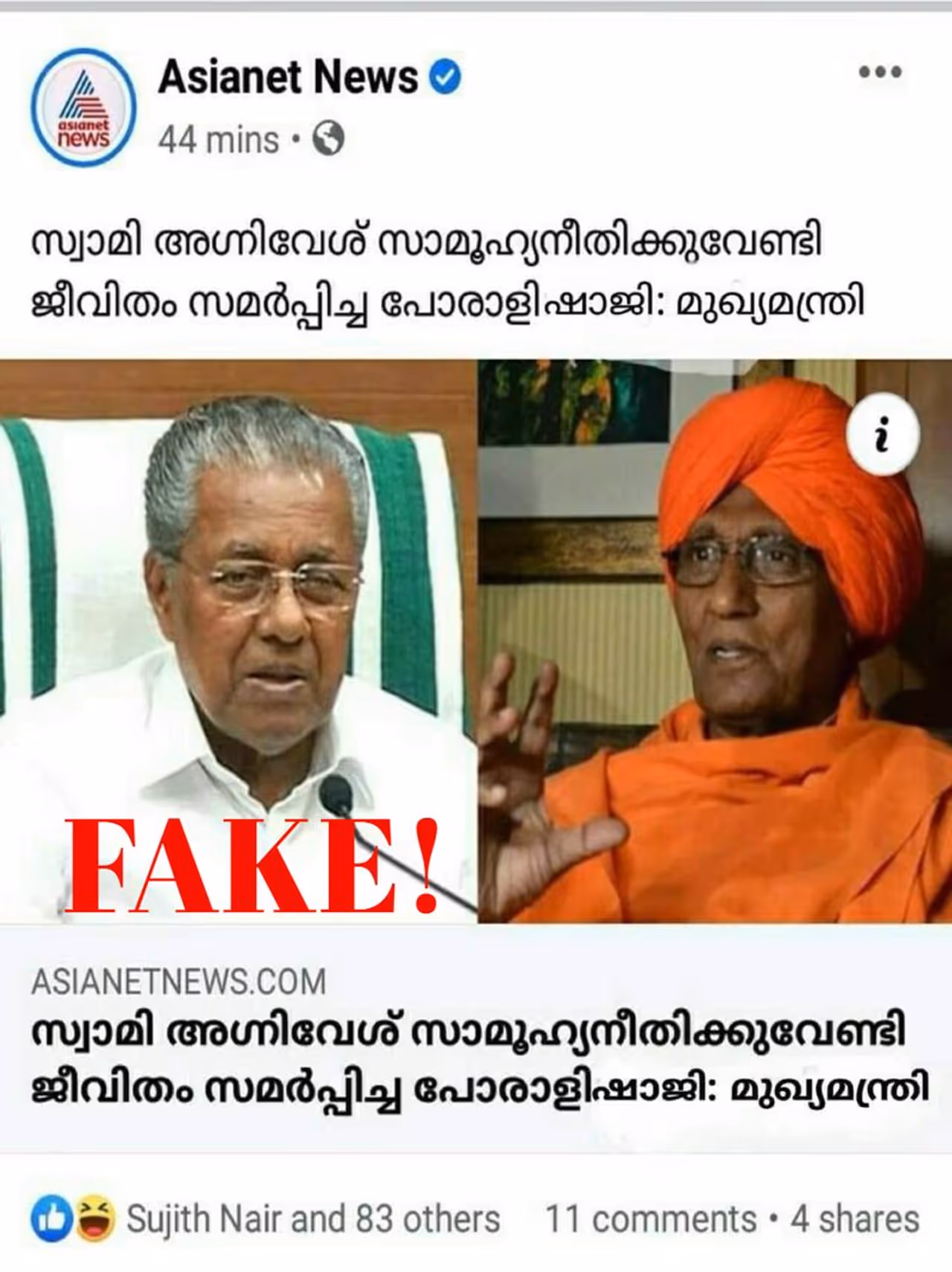 സ്വാമി അഗ്നിവേശ് അന്തരിച്ചപ്പോൾ മുഖ്യമന്ത്രി പിണറായി വിജയൻ അദ്ദേഹത്തിന്റെ വിയോഗത്തിൽ അനുശോചനം രേഖപ്പെടുത്തി വാർത്താക്കുറിപ്പ് ഇറക്കിയിരുന്നു. അത് ഏഷ്യാനെറ്റ് ന്യൂസ് റിപ്പോർട്ട് ചെയ്തത് എഡിറ്റ് ചെയ്ത് മാറ്റി വ്യാജപ്രചാരണം നടക്കുന്നതിന് മറുപടിയാണിത്.