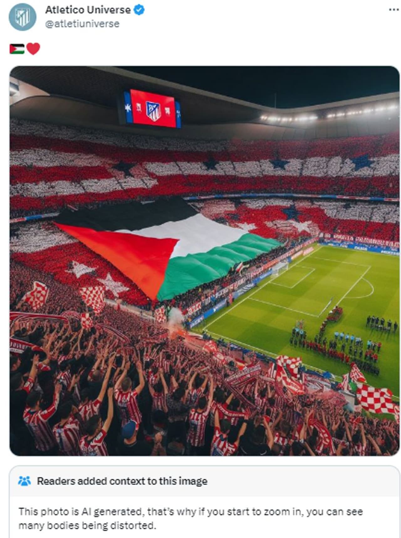 അത്ലറ്റികോ മാഡ്രിഡിന്റെ ആരാധകര് ഗാസയ്ക്ക് പിന്തുണയുമായി കൂറ്റന് പലസ്തീന് പതാക ഗ്യാലറിയില് വീശി എന്ന് ചിത്രം സഹിതമുള്ള പ്രചാരണം തെറ്റാണ്. എഐ സാങ്കേതിക വിദ്യയുടെ സഹായത്തോടെ തയ്യാറാക്കിയ ചിത്രമാണ് പ്രചരിക്കുന്നത് എന്നാണ് മനസിലാക്കുന്നത്.