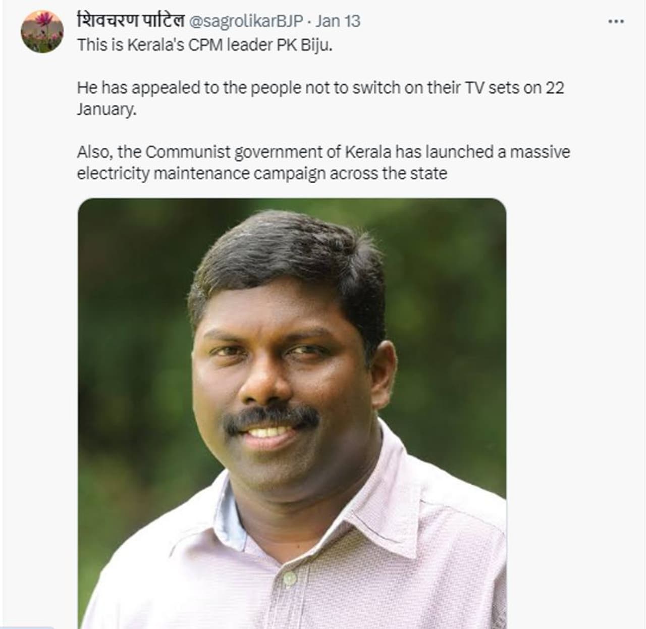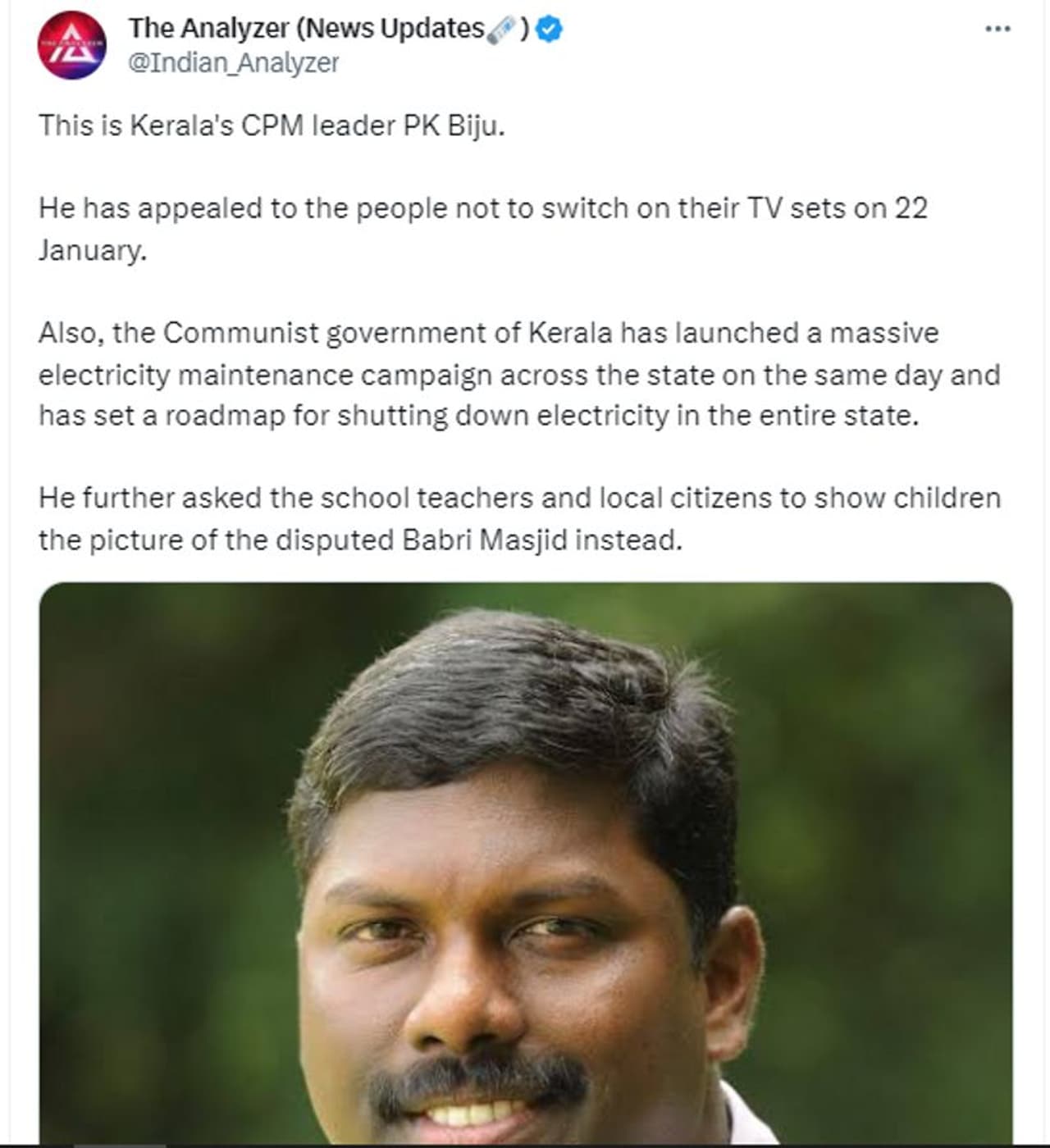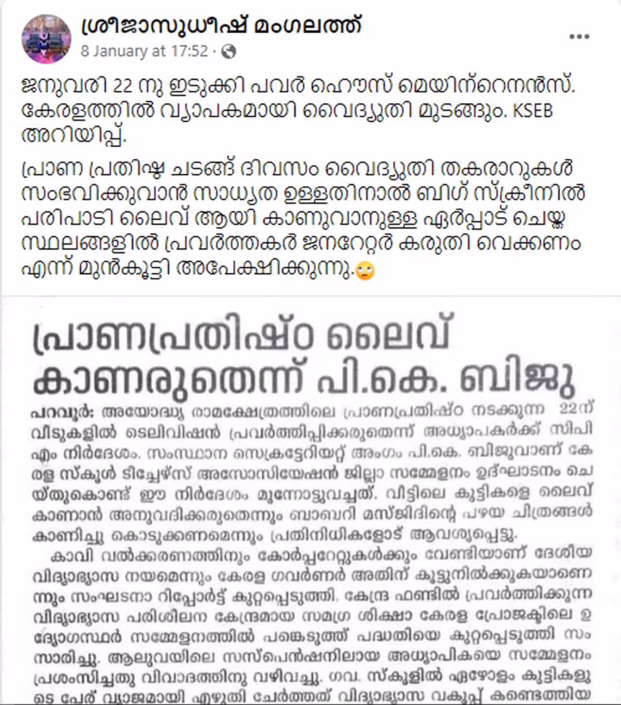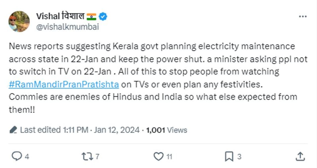 അയോധ്യ പ്രതിഷ്ഠാകര്മ്മം നടക്കുന്ന 2024 ജനുവരി 22ന് കേരളത്തില് വ്യാപകമായി വൈദ്യുതി മുടങ്ങും എന്ന പ്രചാരണം വ്യാജമാണ്.