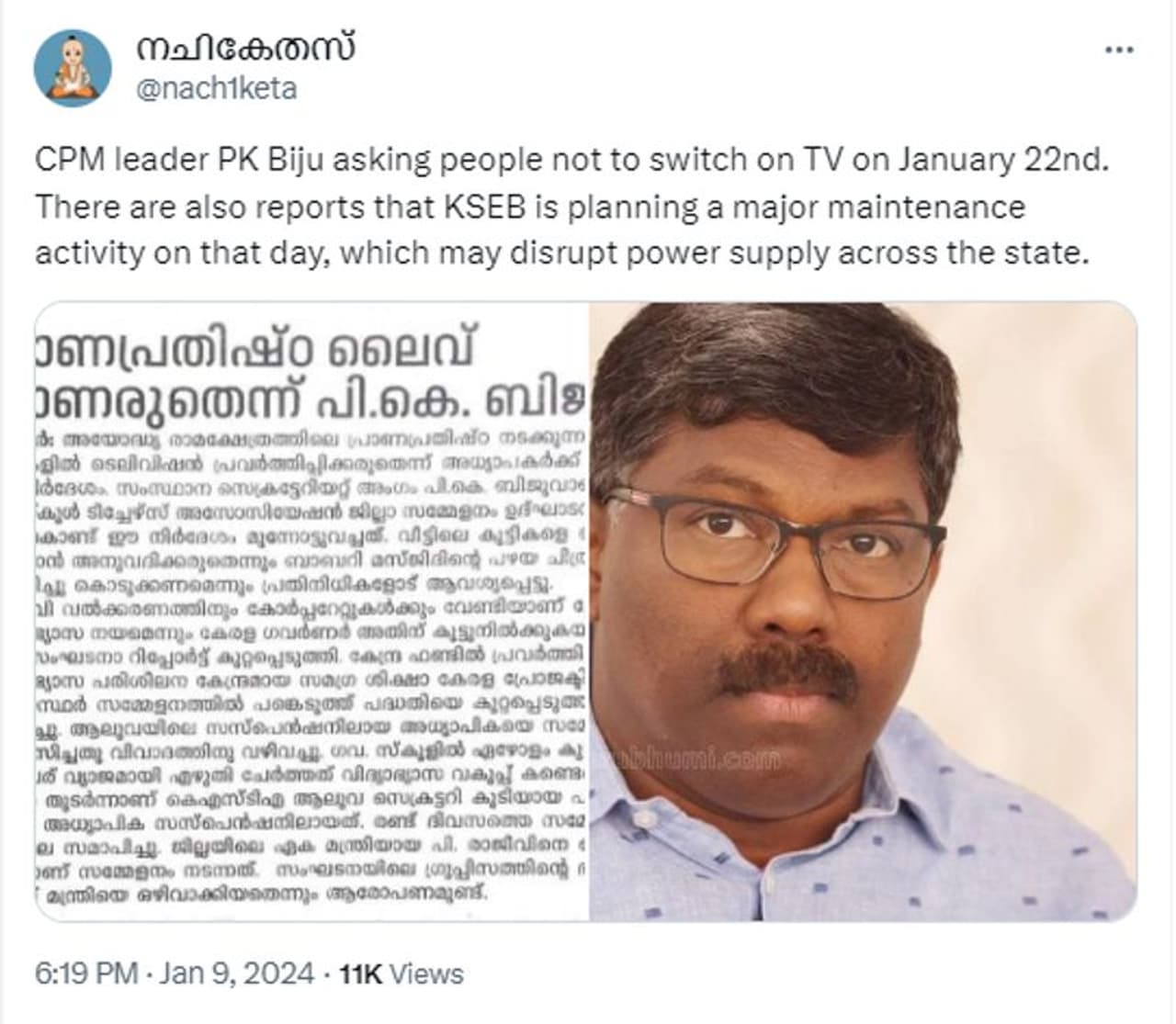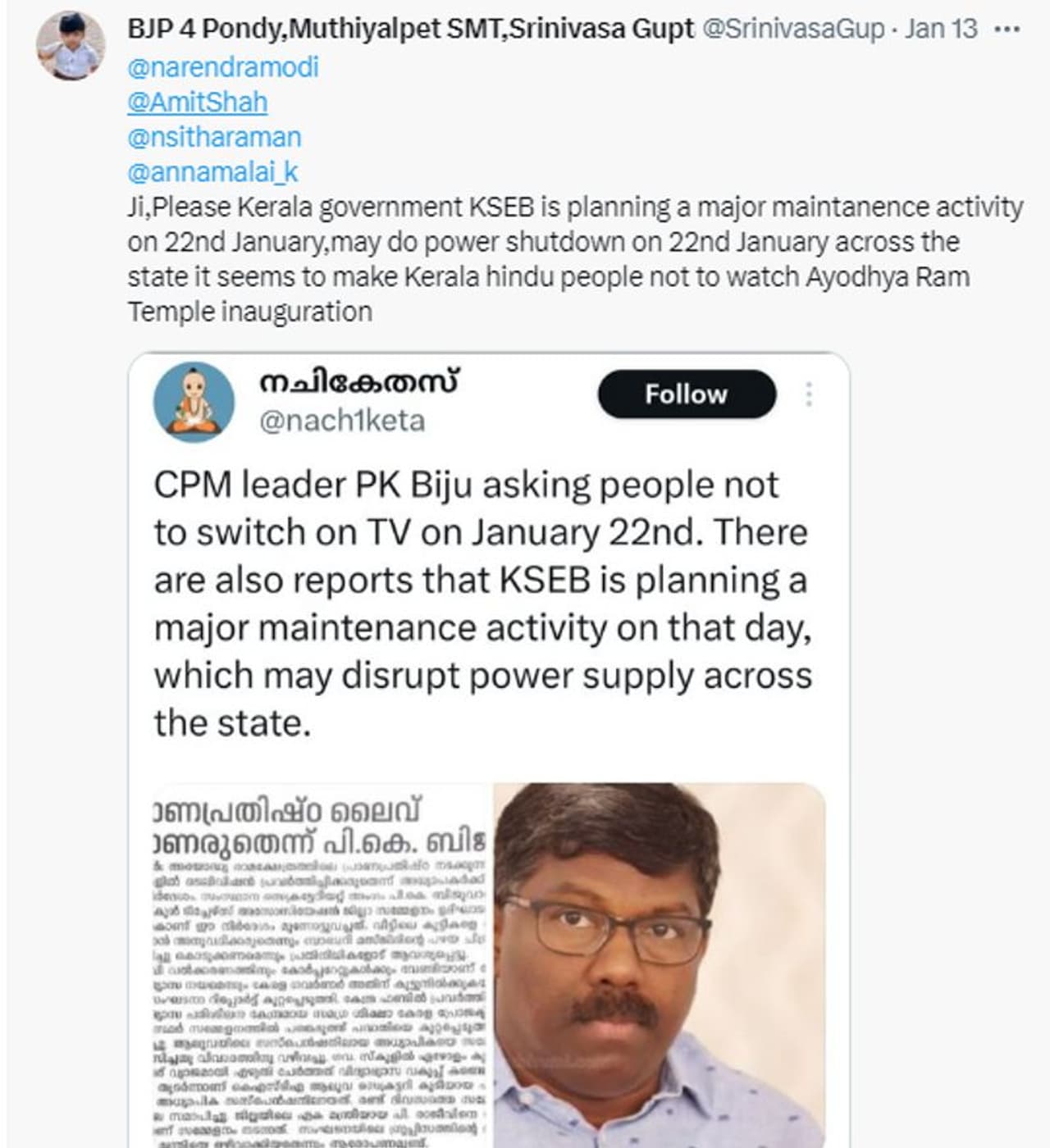 അയോധ്യയിലെ രാമക്ഷേത്രത്തില് പ്രതിഷ്ഠാകര്മ്മം നടക്കുന്ന 2024 ജനുവരി 22-ാം തിയതി കേരളത്തില് വ്യാപകമായി വൈദ്യുതി മുടങ്ങും എന്ന പ്രചാരണം മറ്റൊരു സാമൂഹ്യമാധ്യമമായ എക്സിലും (പഴയ ട്വിറ്റര്) സജീവമാണ്. കേരളത്തില് കെഎസ്ഇബിയുടെ വലിയ അറ്റകുറ്റപണി അന്നേദിനം നടക്കുന്നതായും അതിനാല് വൈദ്യുതി മുടങ്ങും എന്നുമാണ് ഈ ട്വീറ്റുകളിലെല്ലാമുള്ളത്. അവയുടെ ലിങ്ക് 1, 2, 3, 4, 5, 6 എന്നിവയില് വായിക്കാം. ട്വീറ്റുകളുടെ സ്ക്രീന്ഷോട്ടുകള് ചുവടെ ചേര്ക്കുന്നു.