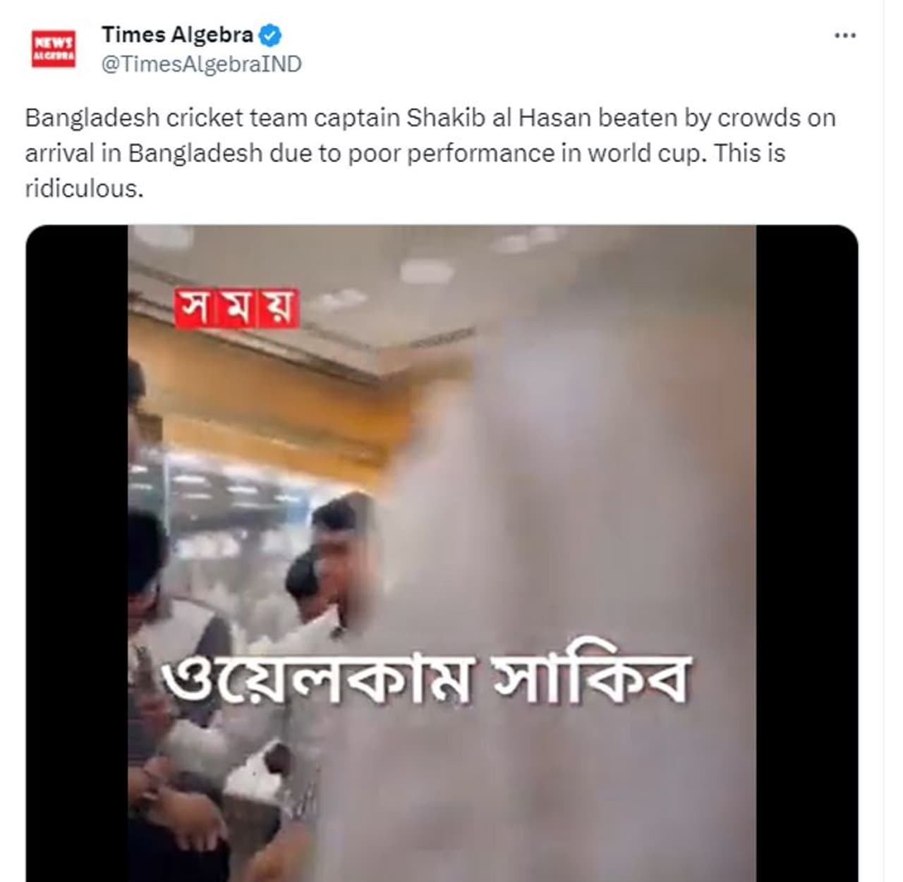 'ലോകകപ്പിലെ മോശം പ്രകടനത്തിന് ശേഷം നാട്ടില് തിരിച്ചെത്തിയ ഷാക്കിബ് അല് ഹസനും ബംഗ്ലാദേശ് ആരാധകരും' എന്ന തലക്കെട്ടോടെയാണ് 25 സെക്കന്ഡ് ദൈര്ഘ്യമുള്ള വീഡിയോ ട്വീറ്റ് ചെയ്തിരിക്കുന്നത്. വലിയ ആള്ക്കൂട്ടത്തിന് ഇടയിലൂടെ ഷാക്കിബ് അല് ഹസന് തിക്കി കടന്നുവരുന്നത് വീഡിയോയില് കാണാം. ആരാധകരുടെ തിക്കിനും തിരക്കിനുമിടയില് നിലത്ത് വീഴാതെ ഷാക്കിബ് കഷ്ടിച്ചാണ് രക്ഷപ്പെടുന്നത്. മാത്രമല്ല, ഷാക്കിബിന്റെ ഷര്ട്ടില് പിടിച്ച് വലിക്കുന്നുമുണ്ട്. 'ലോകകപ്പ് തോല്വിക്ക് ശേഷം നാട്ടില് തിരിച്ചെത്തിയ ഷാക്കിബ് അല് ഹസന് വിമാനത്താവളത്തില് വച്ച് മര്ദനമേല്ക്കുകയായിരുന്നു' എന്ന് മറ്റൊരു ട്വീറ്റില് കാണാം. ഷാക്കിബിന് മര്ദനമേറ്റു എന്ന തരത്തില് നിരവധി ട്വീറ്റുകള് കാണാനാവുന്നതാണ്, ലിങ്ക് 1, 2, 3.