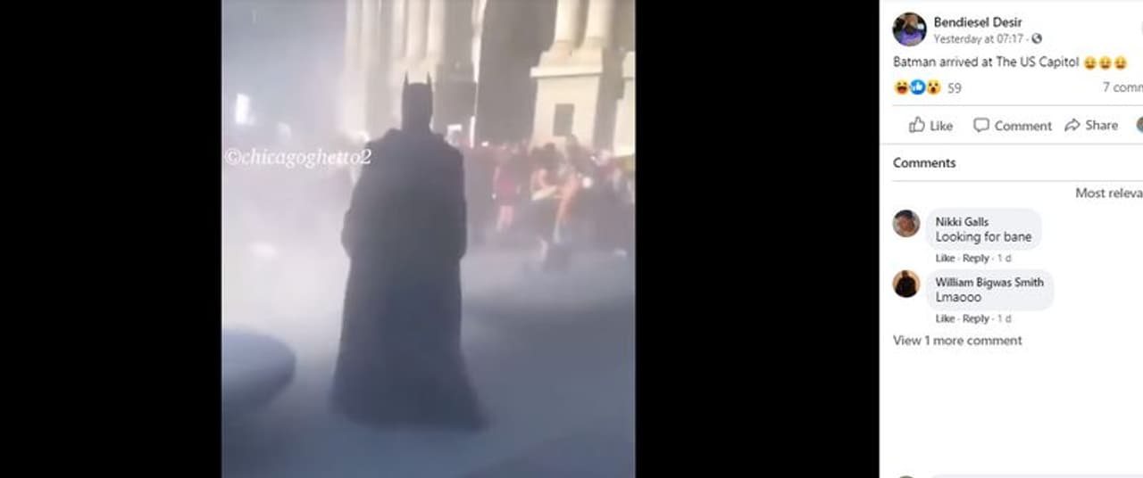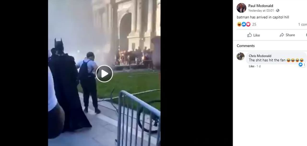 സാമൂഹ്യമാധ്യമങ്ങളില് പ്രചരിക്കുന്ന ഒരു വീഡിയോയാണ് ബാറ്റ്മാന് പ്രചാരണങ്ങള്ക്ക് പിന്നില്. ബാറ്റ്മാന്റെ സ്യൂട്ടണിഞ്ഞയാള് ക്യാപിറ്റോള് ഹില്സിലെത്തിയ ട്രംപ് അനുകൂലികളില് ഒരാളാണ് എന്നാണ് സാമൂഹ്യമാധ്യമങ്ങളില് പ്രചരിക്കുന്നത്. യുഎസ് ക്യാപിറ്റോളില് ബാറ്റ്മാന് എത്തി എന്ന കുറിപ്പുകളോടെയാണ് പ്രചാരണം.
