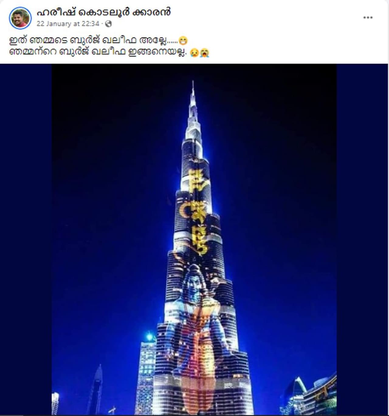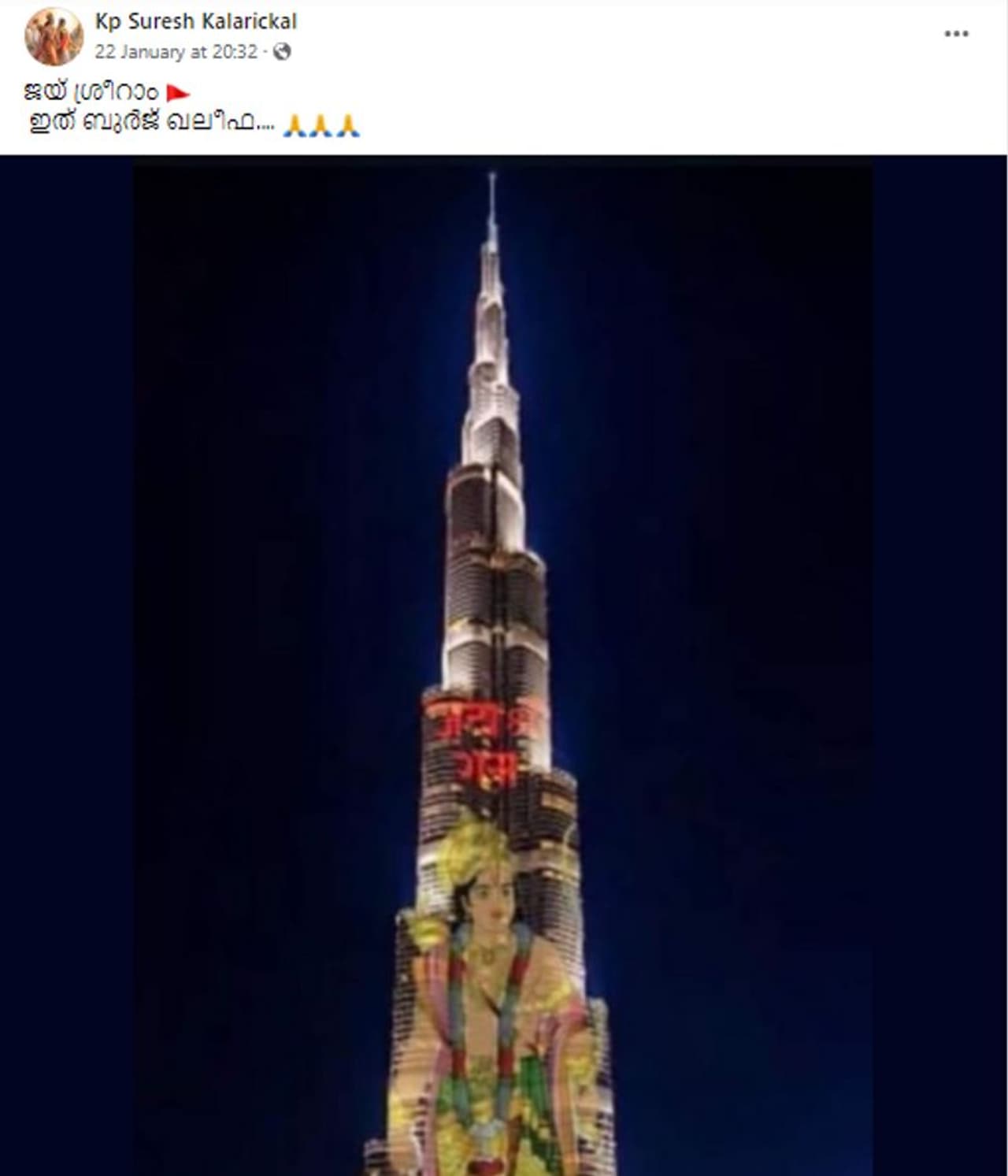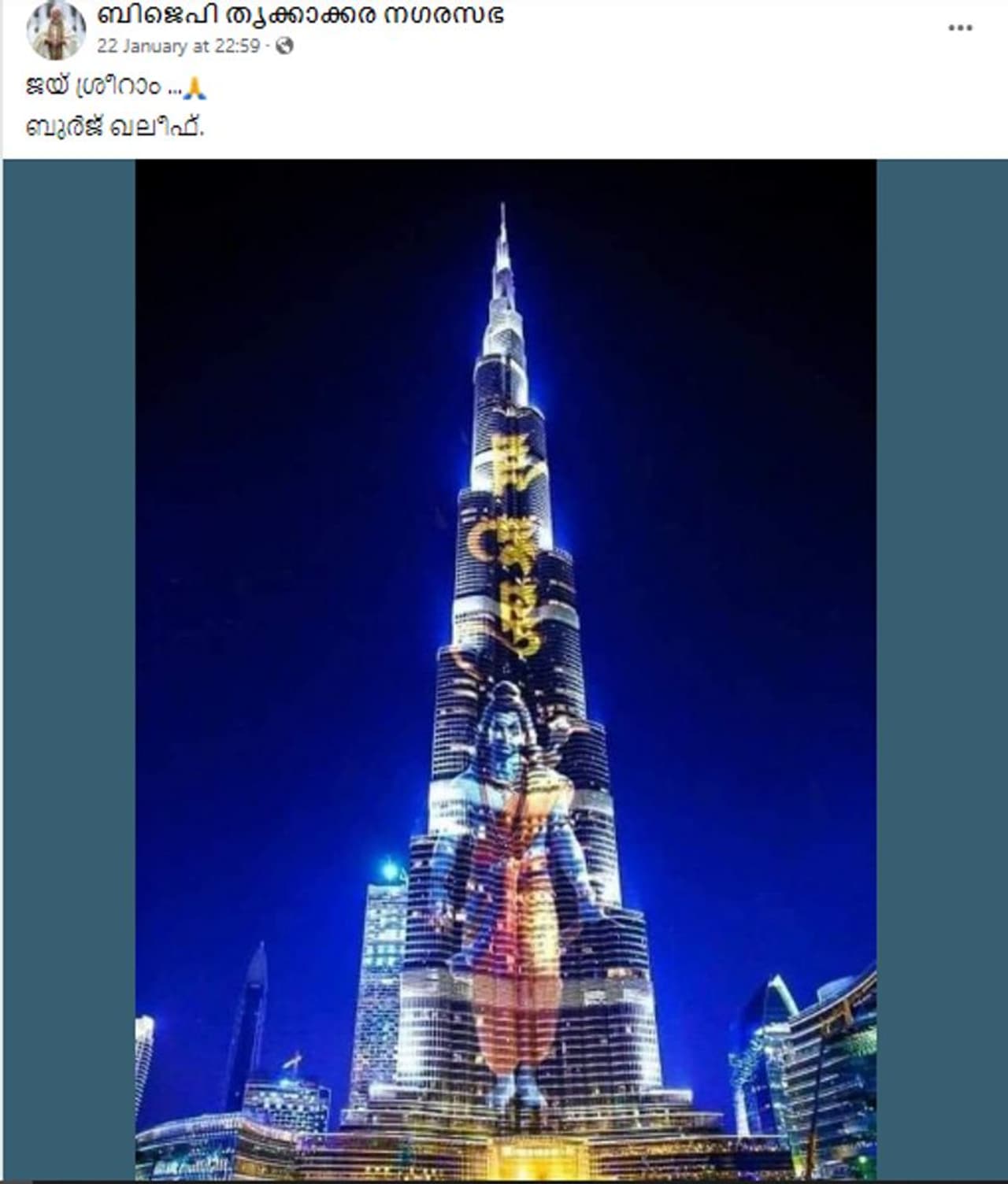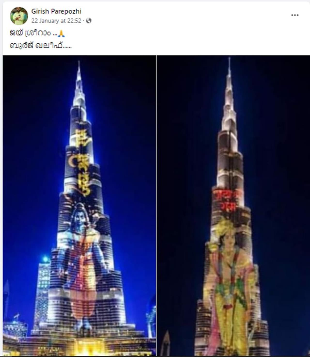 ലോകത്തെ ഏറ്റവും ഉയരം കൂടിയ കെട്ടിടമായ ബുർജ് ഖലീഫയില് ശ്രീരാമന്റെ ചിത്രം തെളിയിച്ചതായി ഫേസ്ബുക്കും വാട്സ്ആപ്പും അടക്കമുള്ള സോഷ്യല് മീഡിയയിലാണ് പ്രചാരണം