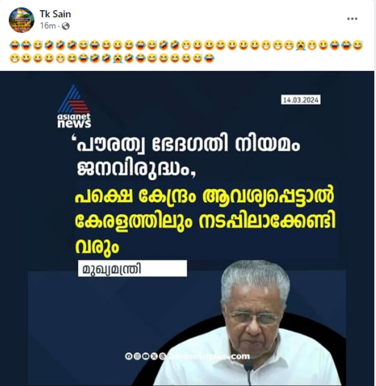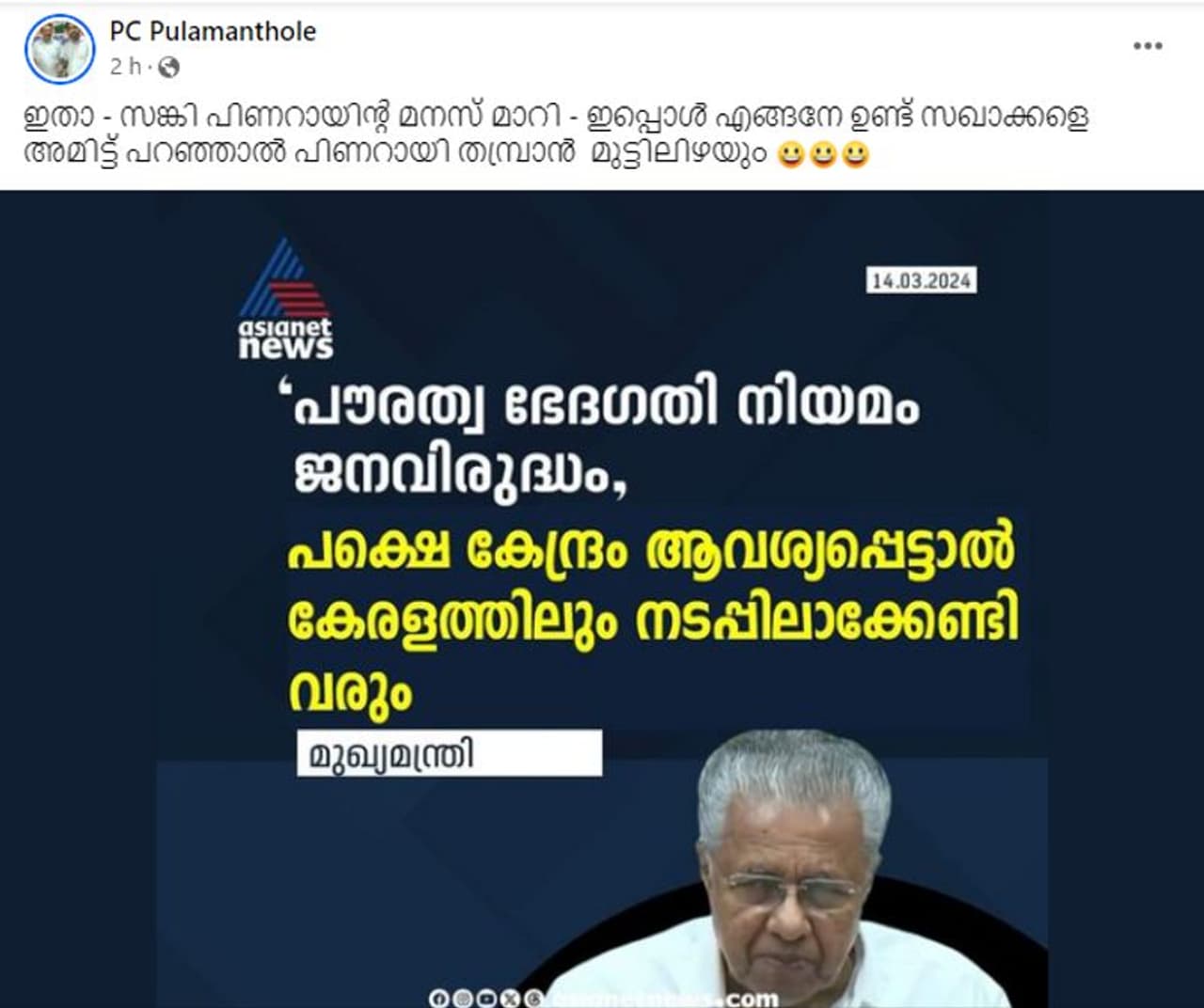 'പൗരത്വ ഭേദഗതി നിയമം ജനവിരുദ്ധം, പക്ഷേ കേന്ദ്രം ആവശ്യപ്പെട്ടാല് കേരളത്തിലും നടപ്പാക്കേണ്ടി വരും' എന്ന തരത്തില് മുഖ്യമന്ത്രി പിണറായി വിജയന് പ്രസ്താവന നടത്തിയിട്ടില്ല എന്നതും വസ്തുതതയാണ്. നിരവധി പേരാണ് ഏഷ്യാനെറ്റ് ന്യൂസിന്റെ പേരിലുള്ള വ്യാജ കാര്ഡ് ഫേസ്ബുക്കില് പ്രചരിപ്പിക്കുന്നത്. അവയുടെ സ്ക്രീന്ഷോട്ടുകള് ചുവടെ ചേര്ക്കുന്നു.