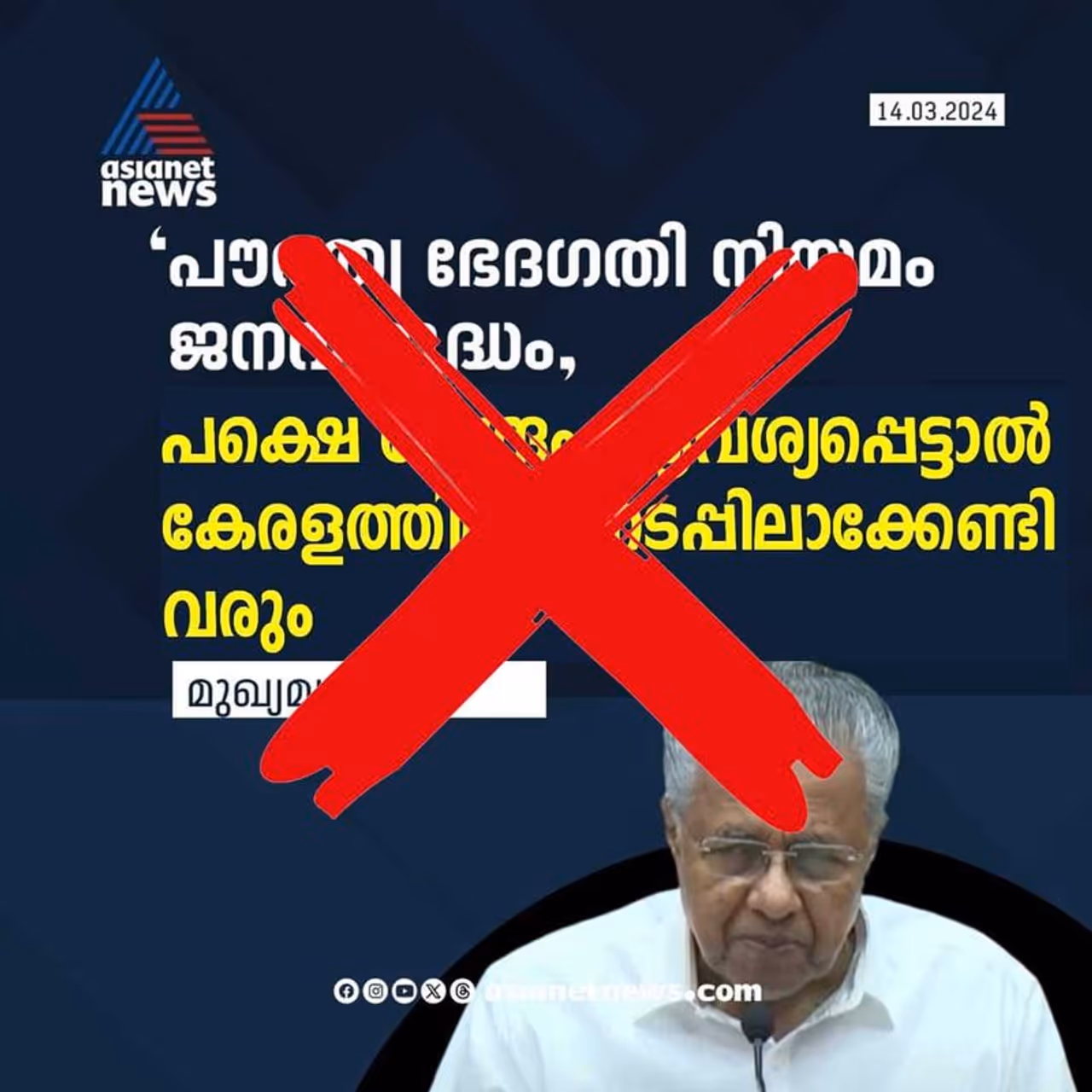 തിരുവനന്തപുരം: പൗരത്വ ഭേദഗതി നിയമവുമായി ബന്ധപ്പെട്ട് ഏഷ്യാനെറ്റ് ന്യൂസിന്റെ പേരില് വ്യാജ വാര്ത്താ കാര്ഡ് പ്രചരിക്കുന്നു. 'പൗരത്വ ഭേദഗതി നിയമം ജനവിരുദ്ധം, പക്ഷേ കേന്ദ്രം ആവശ്യപ്പെട്ടാല് കേരളത്തിലും നടപ്പാക്കേണ്ടി വരും' എന്ന് മുഖ്യമന്ത്രി പിണറായി വിജയന് പ്രസ്താവന നടത്തിയതായി ഏഷ്യാനെറ്റ് ന്യൂസ് 2024 മാര്ച്ച് 14-ാം തിയതി റിപ്പോര്ട്ട് ചെയ്തു എന്ന തരത്തിലാണ് പ്രചാരണം. എന്നാല് 2024 മാര്ച്ച് 14-ാം തിയതി ഏഷ്യാനെറ്റ് ന്യൂസ് ഒരു സോഷ്യല് മീഡിയ പ്ലാറ്റ്ഫോമുകളിലും ഇത്തരമൊരു വാര്ത്താ കാര്ഡ് പ്രസിദ്ധീകരിച്ചിട്ടില്ല എന്നറിയിക്കുന്നു. ഏഷ്യാനെറ്റ് ന്യൂസിനെതിരെ വ്യാജ പ്രചാരണം നടത്തുന്നവര്ക്കെതിരെ നിയമ നടപടി സ്വീകരിക്കുന്നതാണ്.