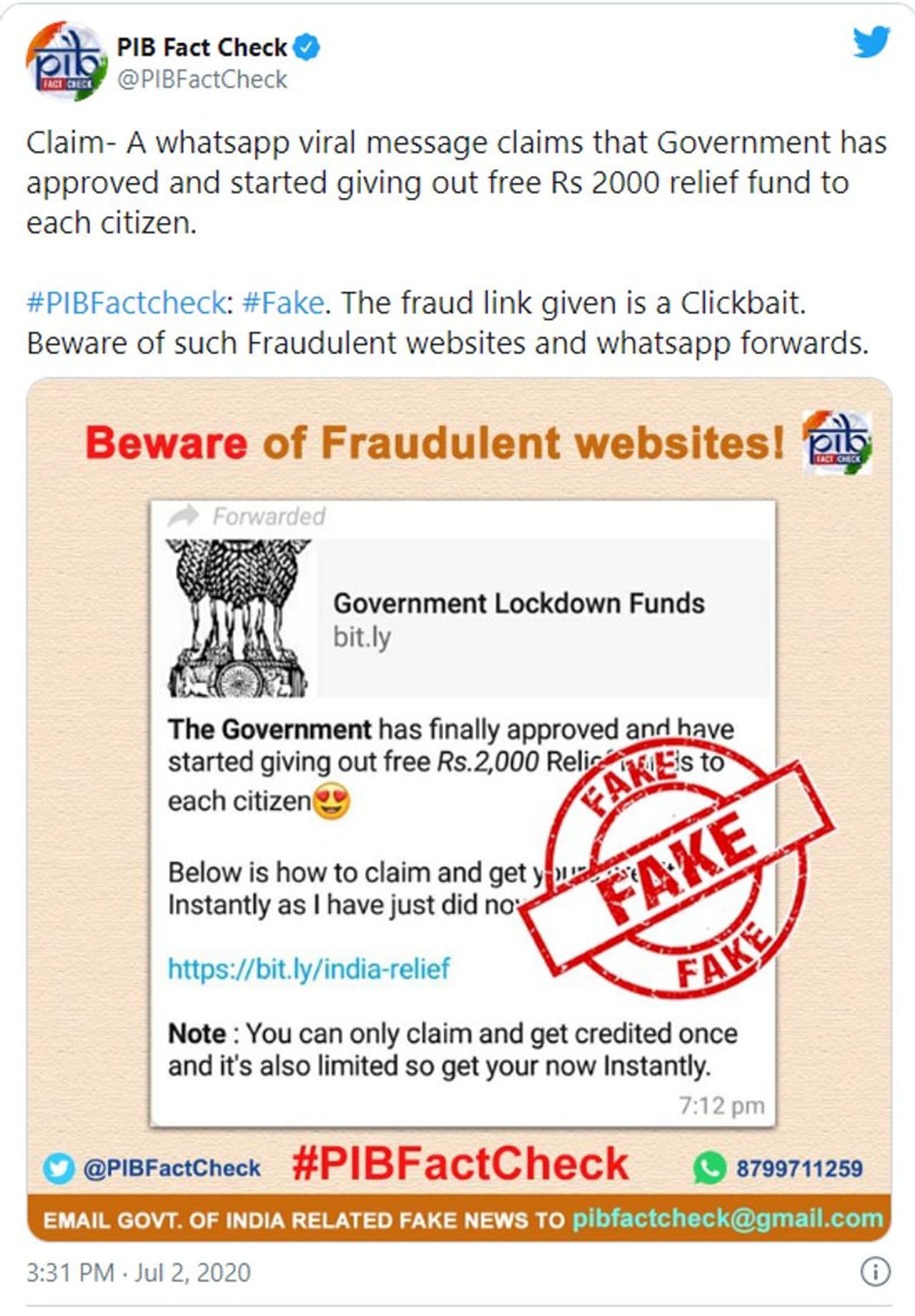 പ്രചരിക്കുന്ന സന്ദേശവും ലിങ്കും വ്യാജമാണ് എന്ന് പ്രസ് ഇന്ഫര്മേഷന് ബ്യൂറോ(പിഐബി) വ്യക്തമാക്കി. ഇത്തരം വ്യാജ വാട്സ്ആപ്പ് സന്ദേശങ്ങളില് വീഴരുതെന്നും ലിങ്കുകളില് ക്ലിക്ക് ചെയ്യരുത് എന്നും പിഐബി അഭ്യര്ഥിച്ചു.