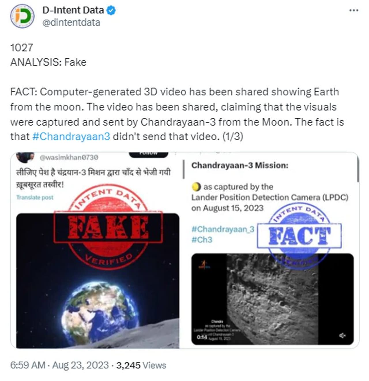 മാത്രമല്ല, കമ്പ്യൂട്ടര് ജനറേറ്റഡ് ത്രീ-ഡി വീഡിയോ ആണിത് എന്ന് ഫാക്ട് ചെക്ക് സംഘമായ ഡി-ഇന്റന്റ് ഡാറ്റ ഓഗസ്റ്റ് 23ന് ട്വീറ്റ് ചെയ്തതും വസ്തുതാ പരിശോധനയില് കണ്ടെത്താനായി. പ്രചരിക്കുന്ന വീഡിയോ ചന്ദ്രയാന് പകര്ത്തിയത് അല്ലെന്നും ഗ്രാഫിക്സാണെന്നും ഇക്കാരണങ്ങള് കൊണ്ട് ഉറപ്പിക്കാം.