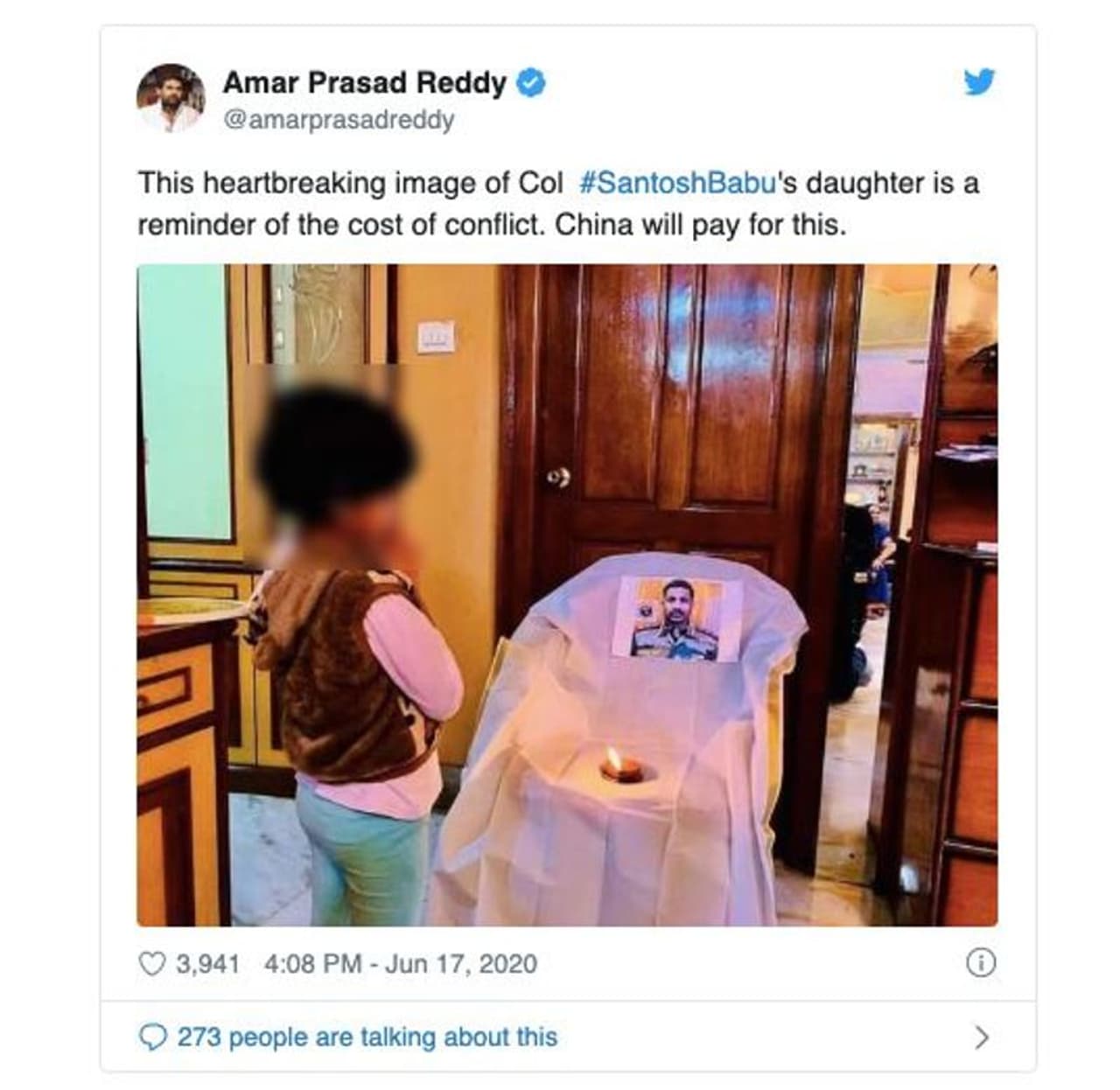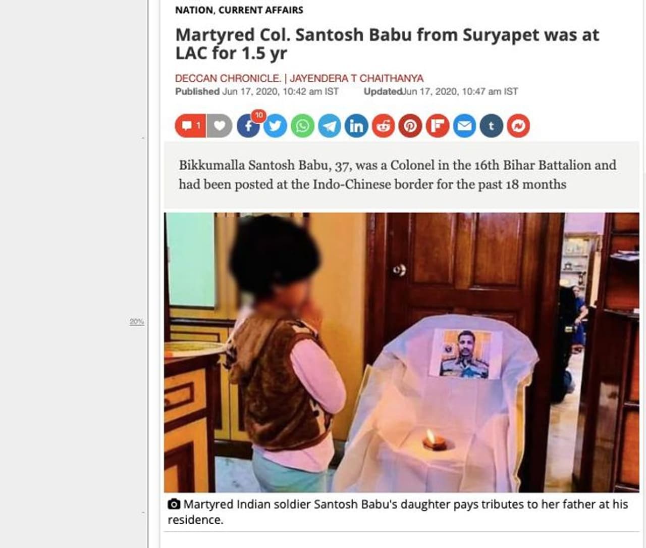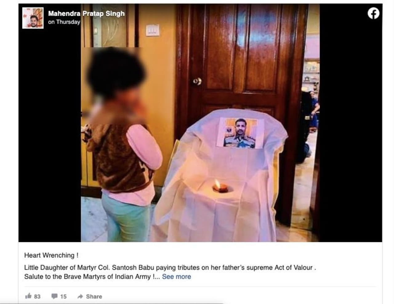 ഡെക്കാന് ക്രോണിക്കിള് അടക്കമുള്ള മാധ്യമങ്ങളും കേണൽ സന്തോഷ് ബാബുവിന്റെ മകളാണ് ചിത്രത്തിലുള്ളത് എന്ന് വാര്ത്ത നല്കിയിരുന്നു.