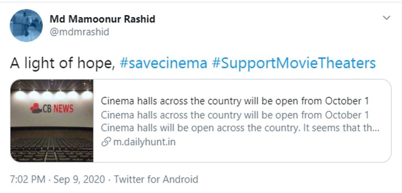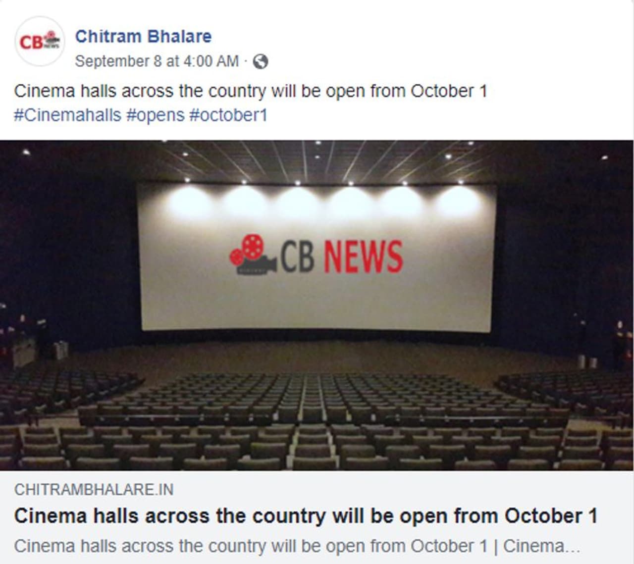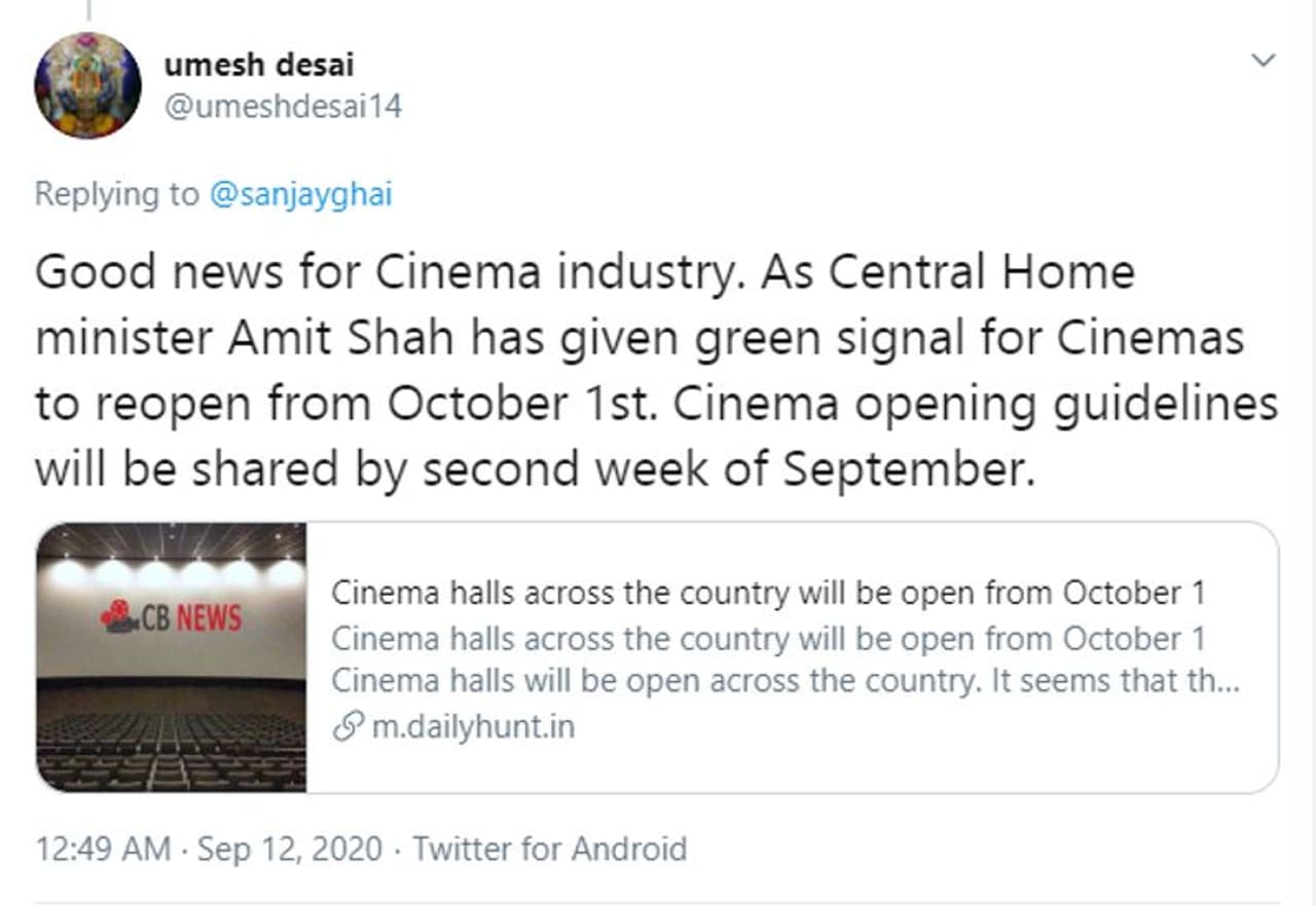 'സിനിമ വ്യവസായത്തിന് സന്തോഷ വാര്ത്ത. ഒക്ടോബര് ഒന്നിന് തീയേറ്ററുകള് തുറക്കാന് കേന്ദ്ര ആഭ്യന്തര മന്ത്രി അമിത് ഷാ പച്ചക്കൊടി കാട്ടിയിരിക്കുന്നു. സെപ്റ്റംബര് രണ്ടാംവാരം ഇതുസംബന്ധിച്ച മാര്ഗനിര്ദേശം പുറത്തുവിടും' എന്നാണ് ഫേസ്ബുക്കുംട്വിറ്ററും ഉള്പ്പടെയുള്ള സാമൂഹ്യമാധ്യമങ്ങളില് പ്രചരിക്കുന്നത്. ചില ഓണ്ലൈന് മാധ്യമങ്ങളും ഇതു സംബന്ധിച്ച് വാര്ത്ത നല്കിയിട്ടുണ്ട്.