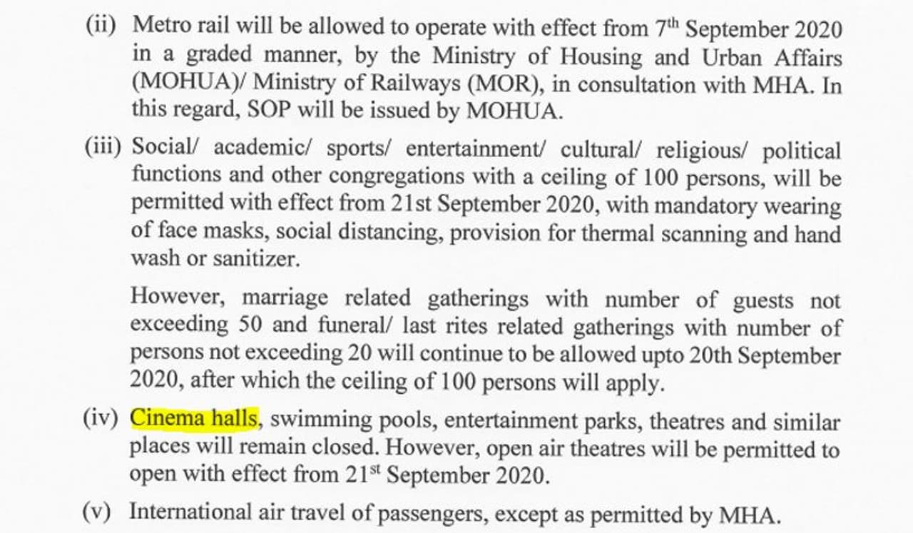 തീയേറ്റുകള് അടഞ്ഞുകിടക്കും എന്നുതന്നെയാണ് കേന്ദ്ര സര്ക്കാര് പുറത്തിറക്കിയ അണ്ലോക്ക് 4 മാര്ഗനിര്ദേശങ്ങളില് നല്കിയിരിക്കുന്നത്. അതേസമയം സെപ്റ്റംബര് 21 മുതല് ഓപ്പണ് എയര് തീയേറ്ററുകള് പ്രവര്ത്തിക്കാന് അനുമതിയുണ്ട്.