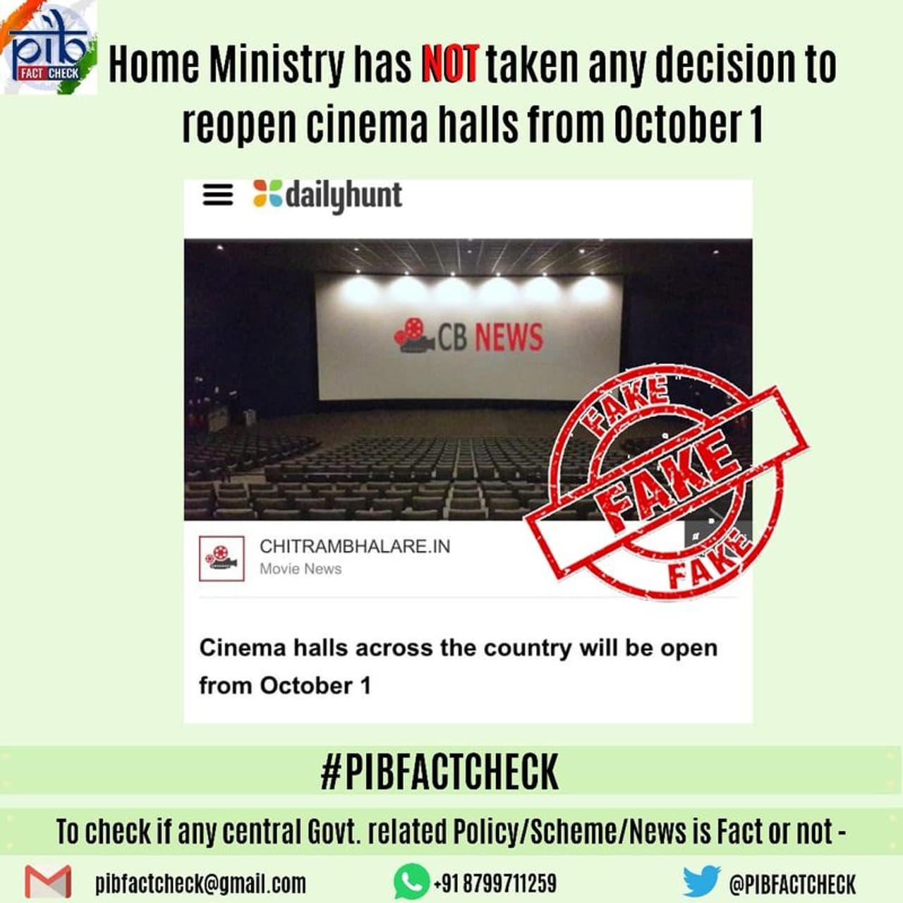തീയേറ്റര് തുറക്കുന്നതുമായി ബന്ധപ്പെട്ട് പ്രചരിക്കുന്ന സന്ദേശം വ്യാജമാണ് എന്ന് പ്രസ് ഇന്ഫര്മേഷന് ബ്യൂറോയുടെ ഫാക്ട് ചെക്ക് വിഭാഗം(പിഐബി ഫാക്ട് ചെക്ക്) സെപ്റ്റംബര് 14ന് അറിയിച്ചിരുന്നു. ഇത് വകവെക്കാതെ ഒക്ടോബര് ഒന്നിന് തീയേറ്ററുകള് തുറക്കും എന്ന പ്രചാരണം ഇപ്പോഴും സജീവമാണ്.