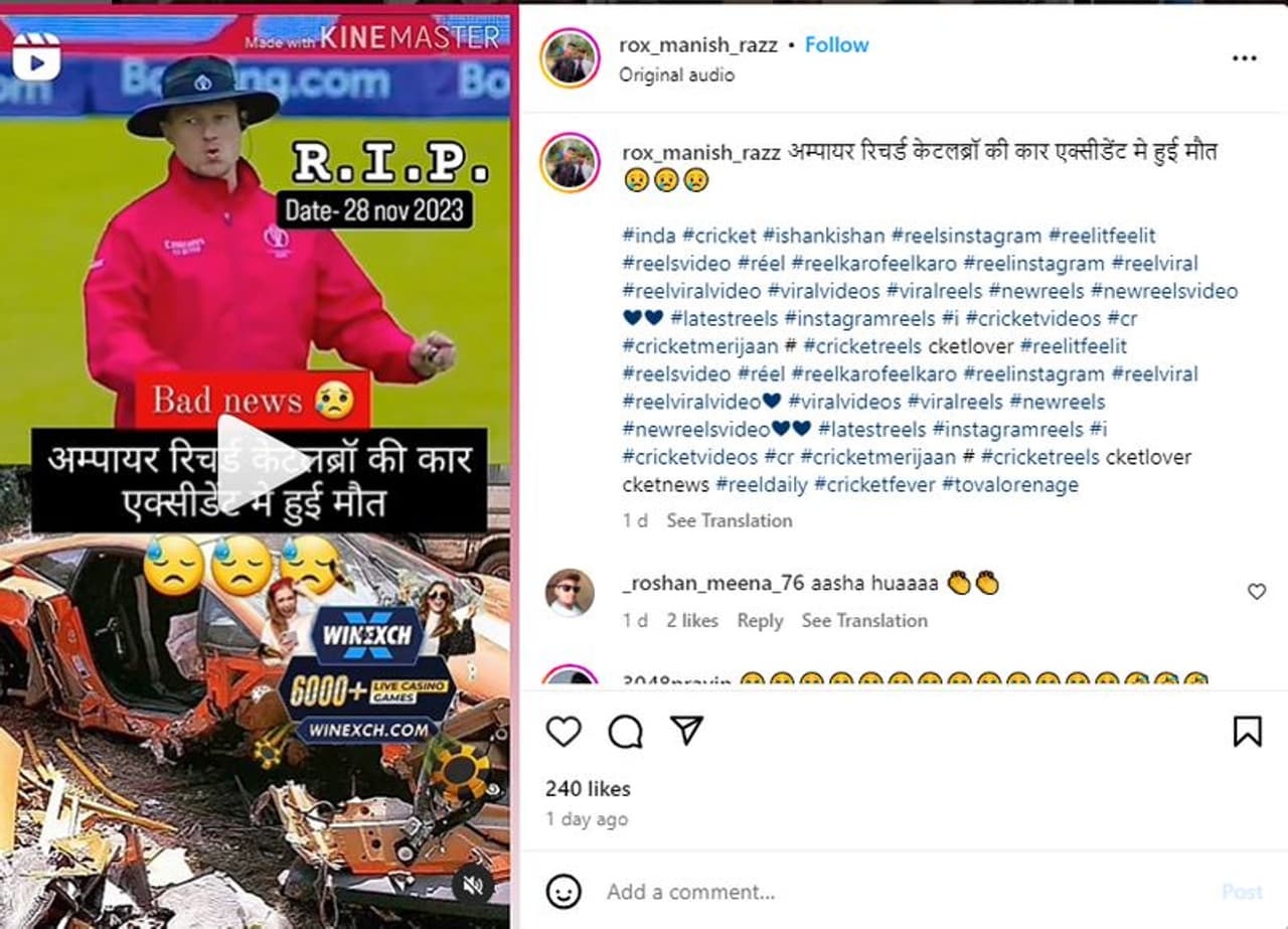 2023 നവംബര് 28ന് നടന്ന കാര് അപകടത്തില് റിച്ചാര്ഡ് കെറ്റില്ബെറോ കൊല്ലപ്പെട്ടു എന്നാണ് ഇന്സ്റ്റഗ്രാം റീല്സില് കാണുന്നത്
