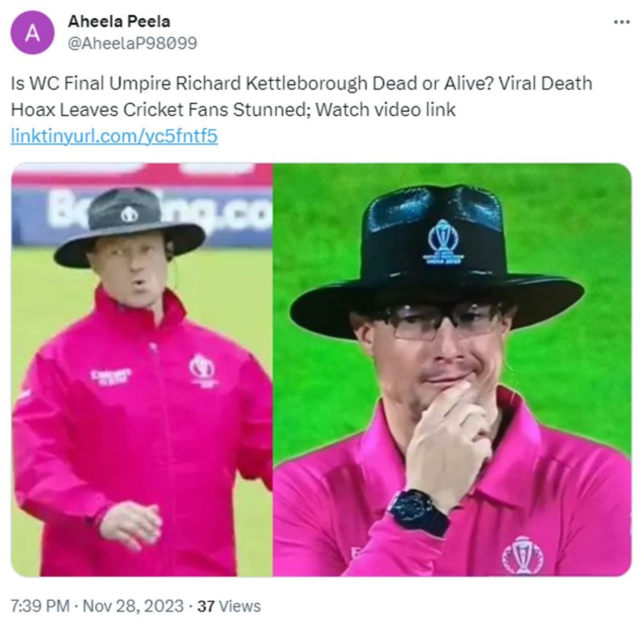 ലോകകപ്പ് അംപയറായ റിച്ചാര്ഡ് കെറ്റില്ബെറോ ജീവനോടെയുണ്ടോ എന്ന് ചോദിച്ച് നിരവധി ട്വീറ്റുകളും കാണാനാവുന്നതാണ്. അവയുടെ ലിങ്കുകള് 1, 2, 3. ട്വീറ്റുകളുടെ സ്ക്രീന്ഷോട്ടുകള് താഴെ കാണാം.