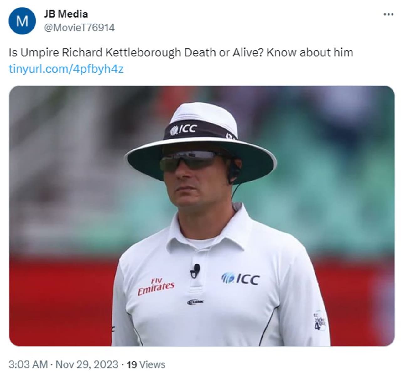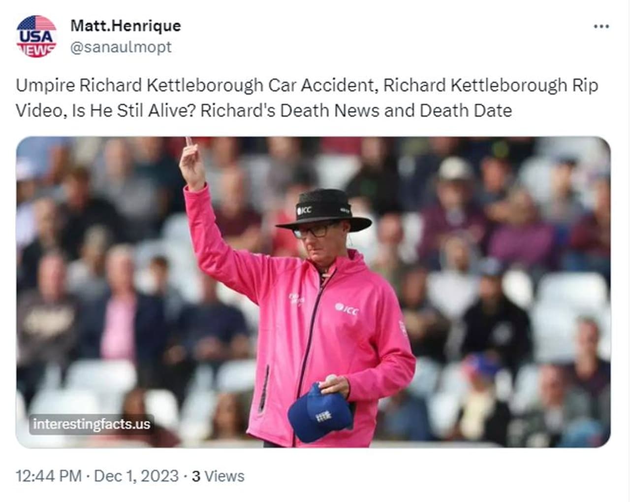 എന്നാല് ക്രിക്കറ്റ് അംപയര് റിച്ചാര്ഡ് കെറ്റില്ബെറോ കാര് അപകടത്തില് മരണമടഞ്ഞിട്ടില്ല എന്നതാണ് യാഥാര്ഥ്യം. അദേഹം സുഖമായിരിക്കുന്നതായി ഐസിസി മീഡിയ മാനേജര് ദി ക്വിന്റിനോട് പറഞ്ഞു.
