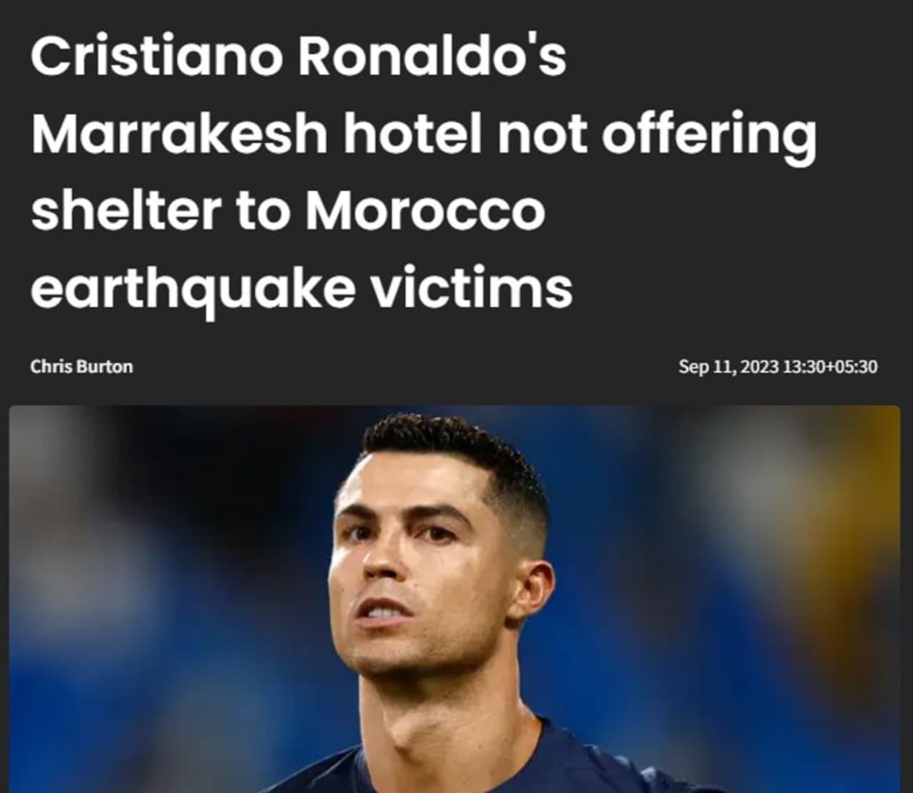 മൊറോക്കോന് ദുരന്തബാധിതര്ക്ക് ക്രിസ്റ്റ്യാനോ റൊണാള്ഡോയുടെ പെസ്റ്റാന സിആര്7 മരാക്കേഷ് ഹോട്ടല് സൗജന്യ താമസമൊരുക്കുന്നു എന്നായിരുന്നു പ്രചരിച്ച വാര്ത്ത. ക്രിസ്റ്റ്യാനോയുടെ ഉടമസ്ഥതയില് മൊറോക്കോയിലെ മരാക്കേഷ് നഗരത്തിലുള്ള ഹോട്ടലാണിത്. ഭൂകമ്പം കനത്ത നാശം വിതച്ച നഗരമാണ് മരാക്കേഷ്. മാര്ക്ക, സ്പോര്ട്ബൈബളില് അടക്കമുള്ള പല ഫുട്ബോള് മാധ്യമങ്ങളും സിആര്7ന്റെ ഹോട്ടല് കാര്യം വാര്ത്തയാക്കി. ചില മലയാളം ഓണ്ലൈനുകളും ഇത്തരത്തില് വാര്ത്ത പ്രസിദ്ധീകരിച്ചിരുന്നു. ക്രിസ്റ്റ്യാനോ ലോകത്തിന് മാതൃകയായി എന്നുപറഞ്ഞ് ഏറെപ്പേര് അദേഹത്തെ പ്രശംസിച്ചു.