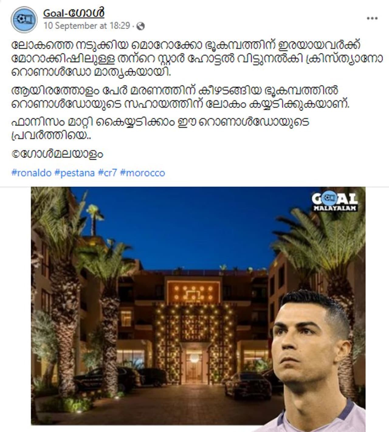 മൊറോക്കോന് ഭൂകമ്പ ദുരന്തബാധിതര്ക്ക് ക്രിസ്റ്റ്യാനോ റൊണാള്ഡോയുടെ പെസ്റ്റാന സിആര്7 മരാക്കേഷ് ഹോട്ടല് സൗജന്യ താമസമൊരുക്കുന്നു എന്നായിരുന്നു പ്രചരിച്ച വാര്ത്ത
