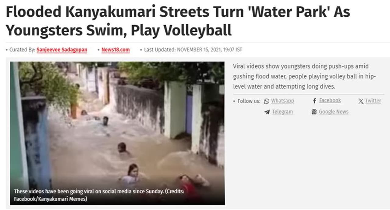 എന്നാല് ഈ വീഡിയോ പഴയതും തമിഴ്നാട്ടിലെ മറ്റൊരു സ്ഥലമായ കന്യാകുമാരിയില് നിന്നുള്ളതുമാണ് എന്നതാണ് യാഥാര്ഥ്യം. പ്രചരിക്കുന്ന വീഡിയോയുടെ ഫ്രെയിമുകള് റിവേഴ്സ് ഇമേജ് സെര്ച്ചിന് വിധേയമാക്കിയപ്പോഴാണ് ഈ നിഗമനത്തില് എത്തിച്ചേരാനായത്. 'പ്രളയമുണ്ടായ കന്യാകുമാരിയിലെ തെരുവിനെ ആളുകള് വാട്ടര് പാര്ക്ക് ആക്കി മാറ്റിയപ്പോള്, യുവാക്കള് നീന്തുകയും വോളിബോള് കളിക്കുകയും ചെയ്യുന്നു' എന്ന തലക്കെട്ടില് ദേശീയ മാധ്യമമായ ന്യൂസ് 18 2021 നവംബര് 15ന് പ്രസിദ്ധീകരിച്ച വാര്ത്ത പരിശോധനയില് കണ്ടെത്താനായി. ഇപ്പോള് ചെന്നൈയിലേത് എന്ന പേരില് പ്രചരിക്കുന്ന വീഡിയോ ഈ വാര്ത്തയില് ന്യൂസ് 18 ഉള്പ്പെടുത്തിയിട്ടുണ്ട്.