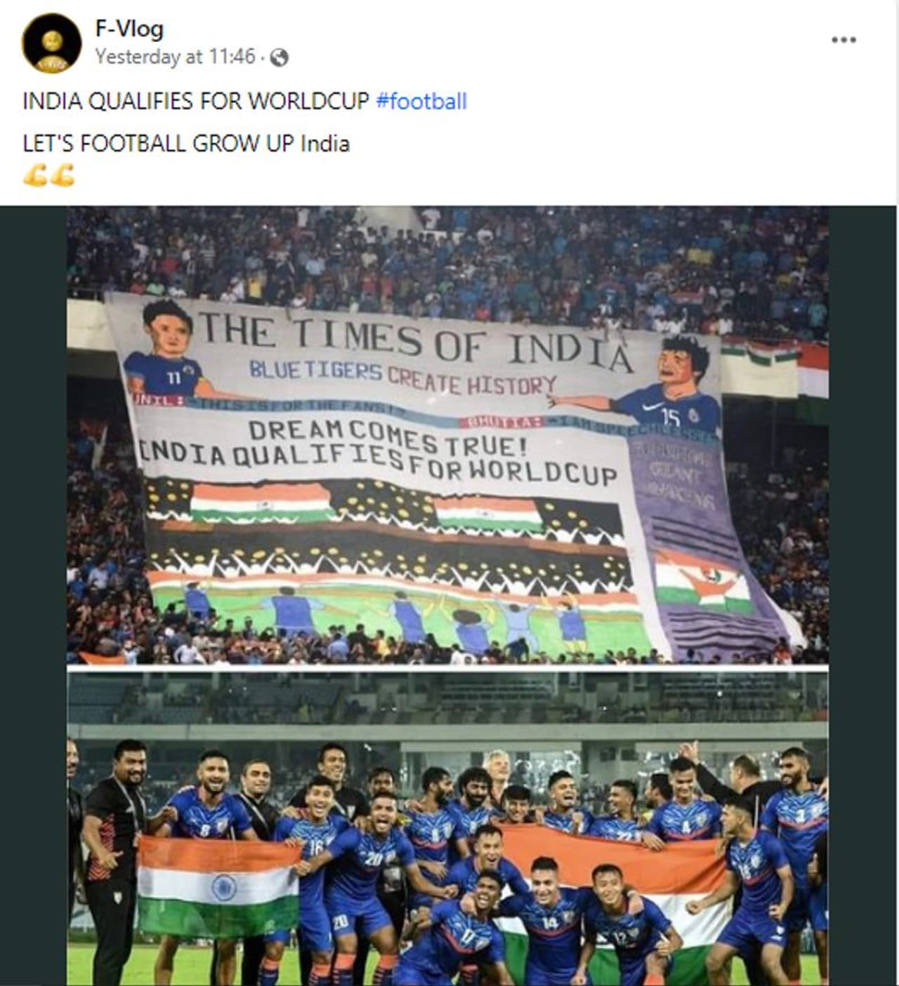ഇന്ത്യന് ഫുട്ബോള് ടീം ഫിഫ ലോകകപ്പിന് യോഗ്യത നേടി. ഫുട്ബോള് ഇന്ത്യയില് വളരട്ടെ എന്ന കുറിപ്പോടെയാണ് രണ്ട് ചിത്രങ്ങളുള്ള ഒരു കൊളാഷ് ഫേസ്ബുക്കില് ഷെയര് ചെയ്യപ്പെടുന്നത്. F-Vlog എന്ന ബ്ലോഗര് 2023 നവംബര് 20ന് എഫ്ബിയില് കൊളാഷ് പോസ്റ്റ് ചെയ്തിരിക്കുന്നതായി കാണാം.