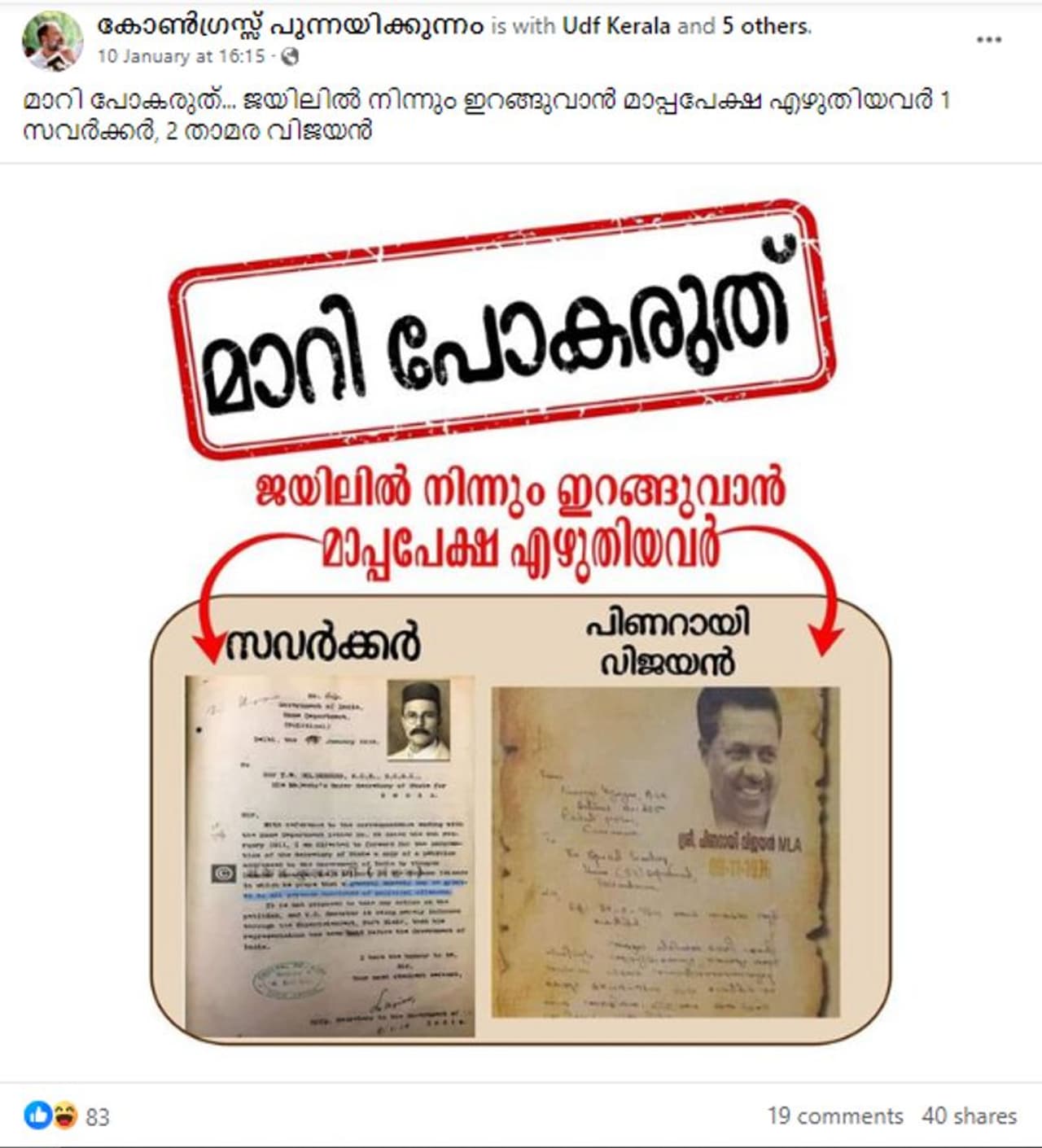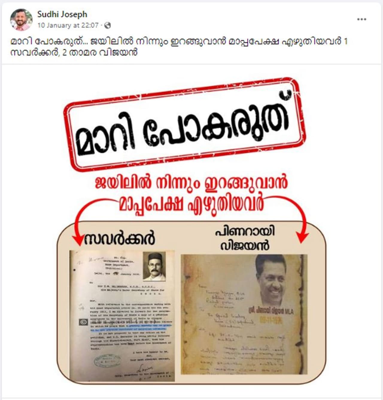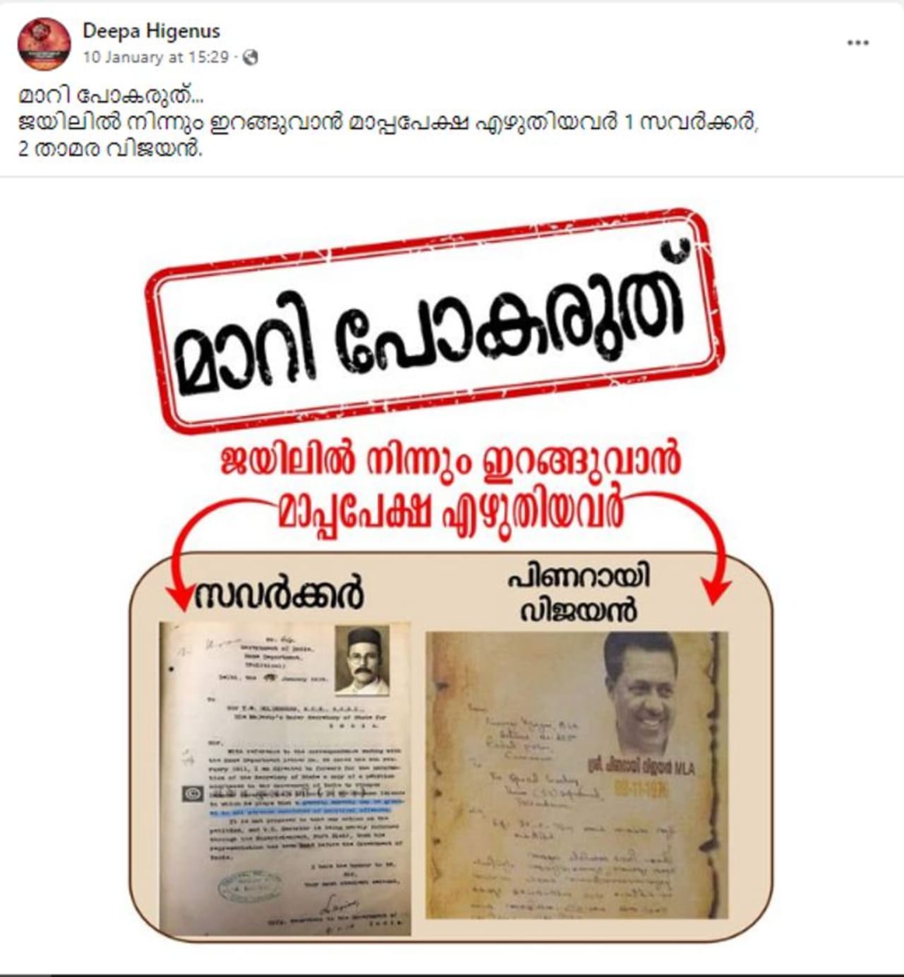 വി ഡി സവര്ക്കറുടെയും പിണറായി വിജയന്റെതുമായി രണ്ട് കത്തുകളുടെ പകര്പ്പിന്റെ കൊളാഷാണ് ഫേസ്ബുക്കില് പ്രചരിക്കുന്നത്. സവര്ക്കറുടെയും പിണറായി വിജയന്റെയും ചിത്രം സഹിതമുള്ള രണ്ട് എഴുത്തുകളാണ് കൊളാഷില് ഉള്ച്ചേര്ത്തിരിക്കുന്നത്. ഈ കൊളാഷ് ഫേസ്ബുക്കില് പോസ്റ്റ് ചെയ്തുകൊണ്ട് കോൺഗ്രസ്സ് പുന്നയിക്കുന്നം എന്ന യൂസര് 2024 ജനുവരി 10ന് ചെയ്ത പോസ്റ്റിന്റെ തലക്കെട്ട് ഇങ്ങനെ... 'മാറി പോകരുത്... ജയിലിൽ നിന്നും ഇറങ്ങുവാൻ മാപ്പപേക്ഷ എഴുതിയവർ 1 സവർക്കർ, 2 താമര വിജയൻ'. എഫ്ബി പോസ്റ്റിന്റെ സ്ക്രീന്ഷോട്ട് ചുവടെ ചേര്ക്കുന്നു.
